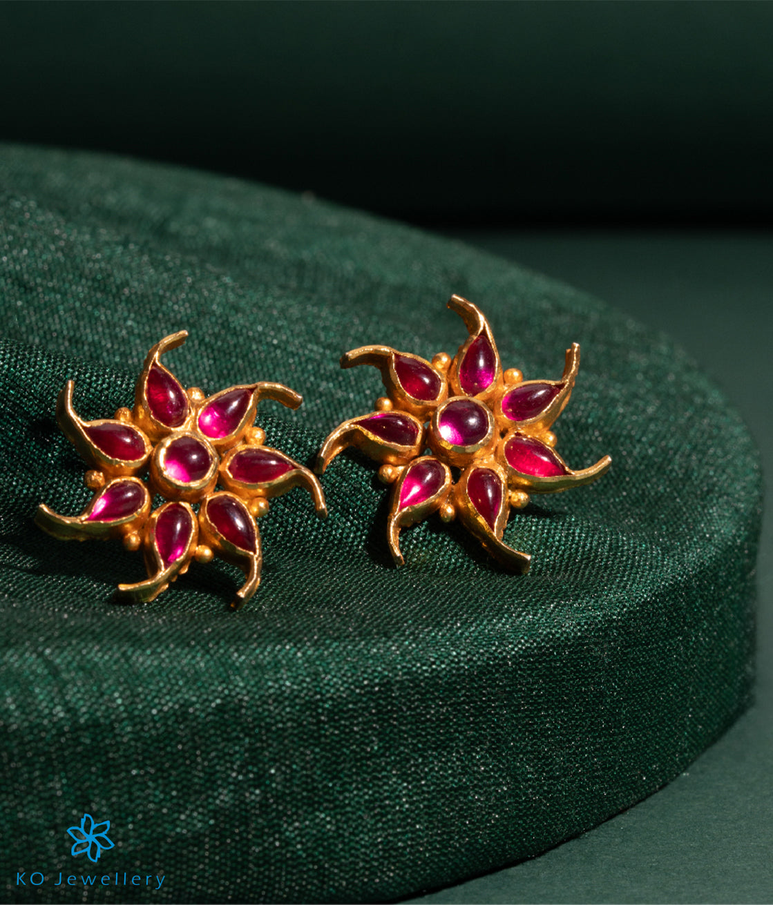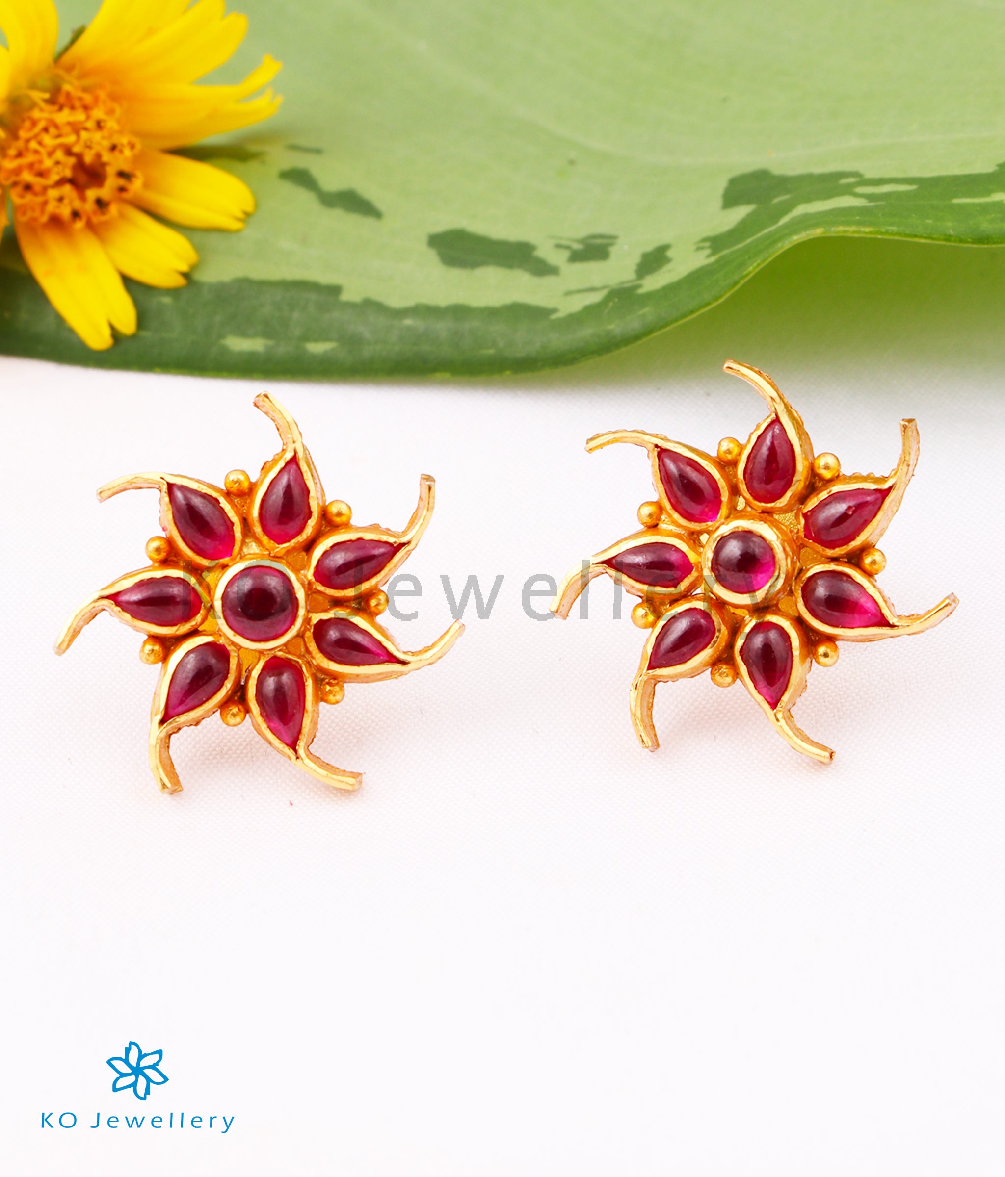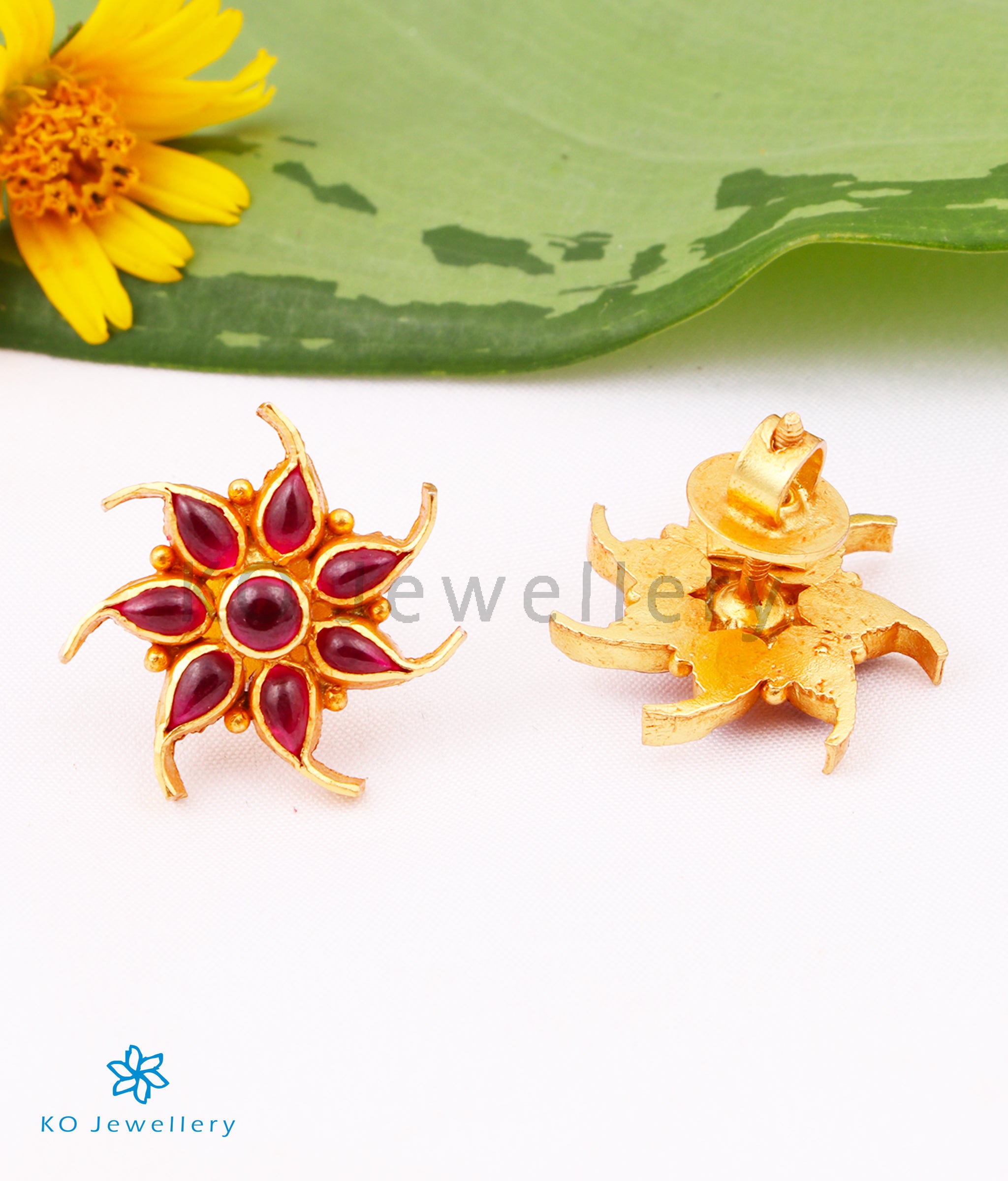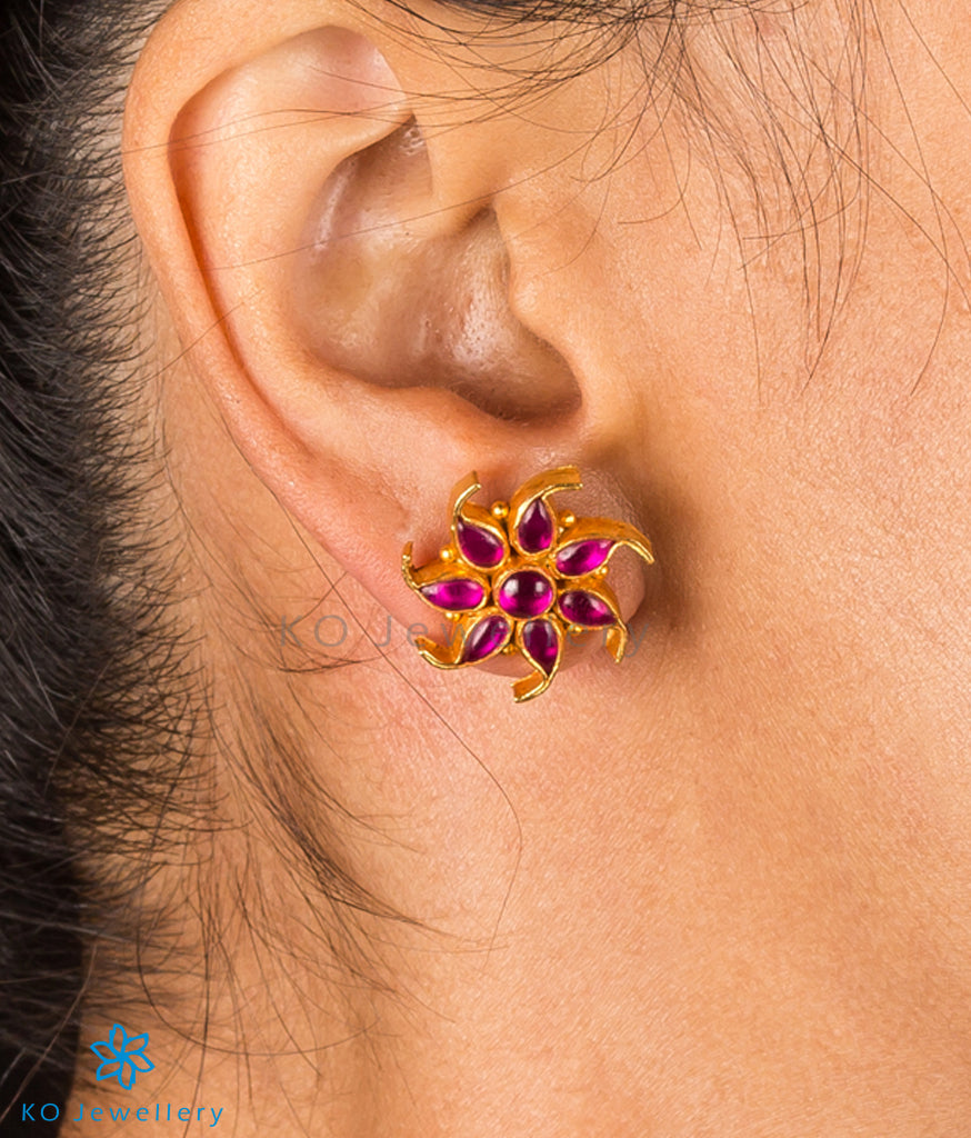 A pretty pair of floral design gold-dipped sterling silver (92.5%) ear-studs handcrafted to perfection and decorated with kempu stones.
