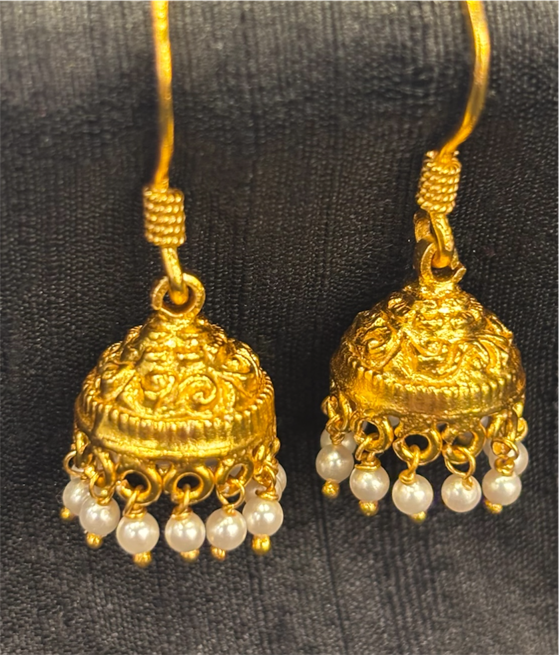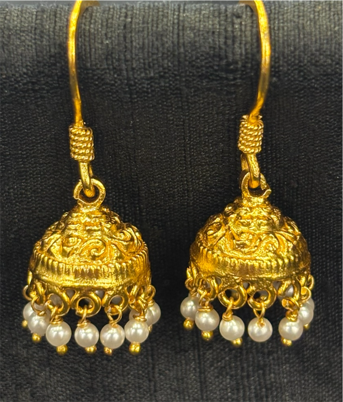 Experience the elegance of South Indian temple jewellery with this exquisitely crafted Sterling Silver (92.5%) jhumka, adorned with natural pearls. Beautifully gold-dipped, its intricate design channels the grandeur of classic antique temple jewellery while remaining lightweight and comfortable to wear.