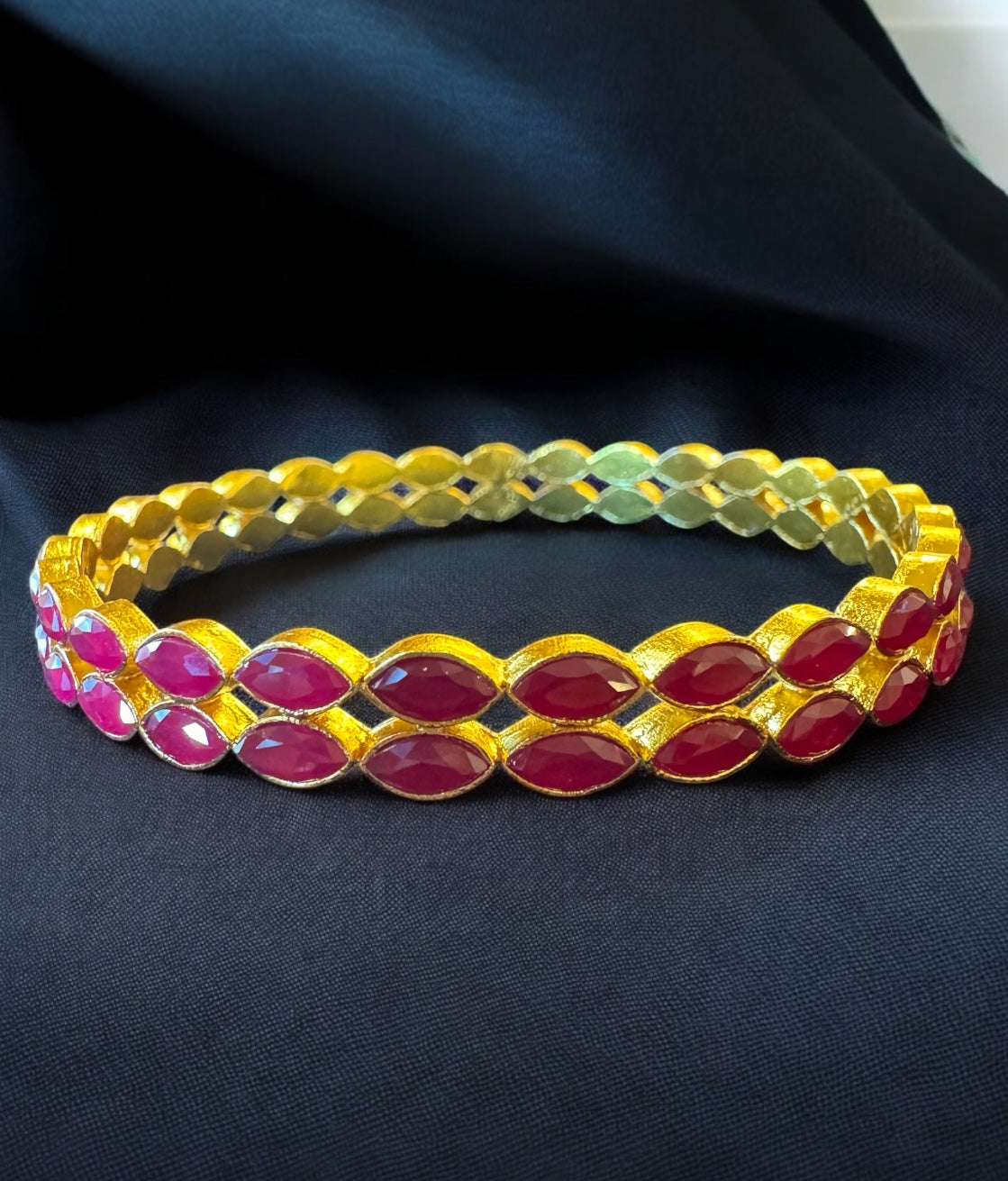 A pretty bangle in an attractive red colour, this makes a great accessory. 'Marquis' shaped red kemp stones come together in Sterling Silver (92.5%) to create this exclusive piece. This seamlessly handcrafted bangle can be bought as a single piece or in a pair. The price listed is for a single bangle.
