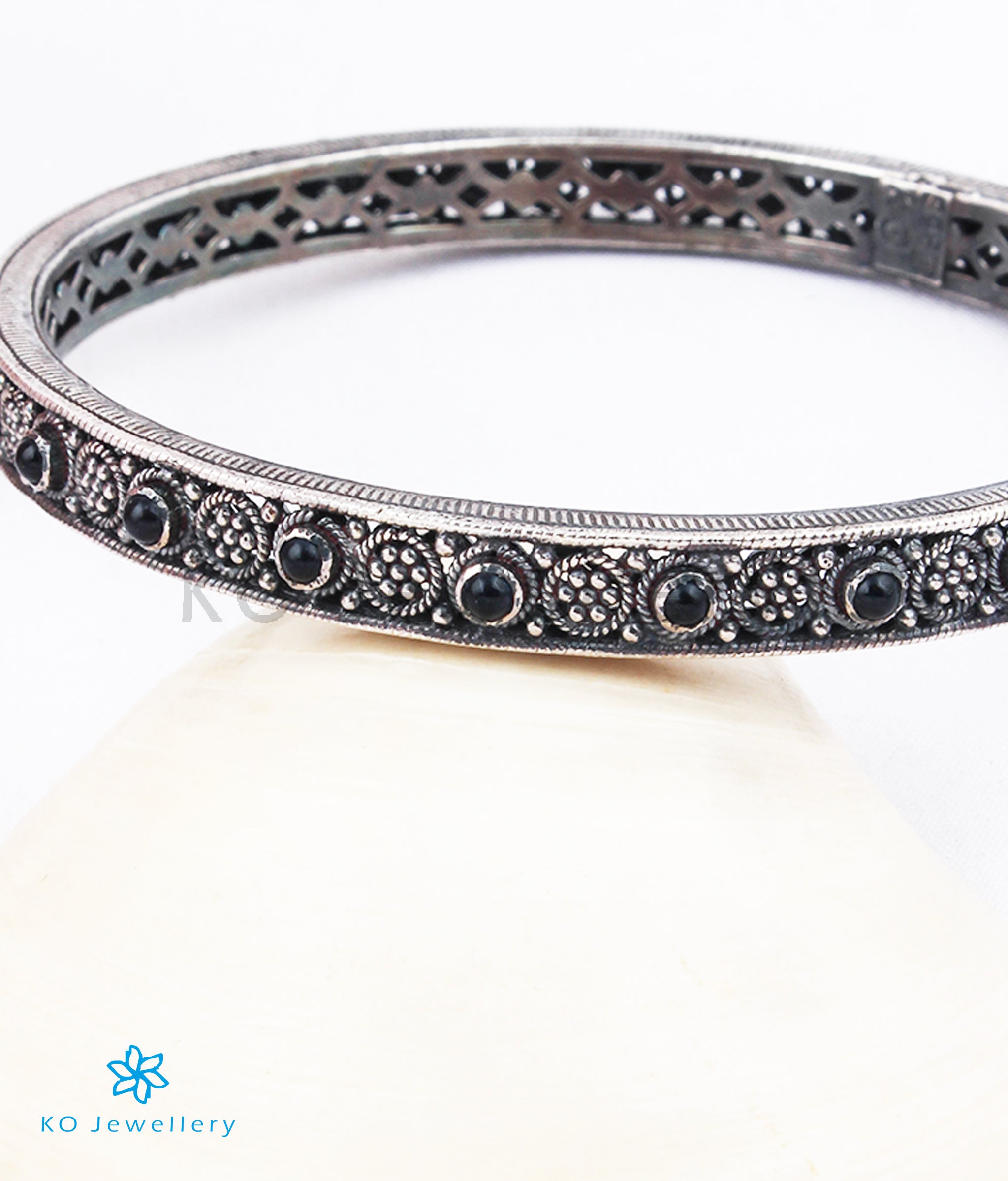 A stunning bangle design in 925 Pure Silver, this is a KO Original designed in house and meticulously handcrafted at our workshop. Each piece undergoes at least 5-6 distinct processes, with a skilled artisan dedicated to each stage, ensuring unparalleled quality and precision.