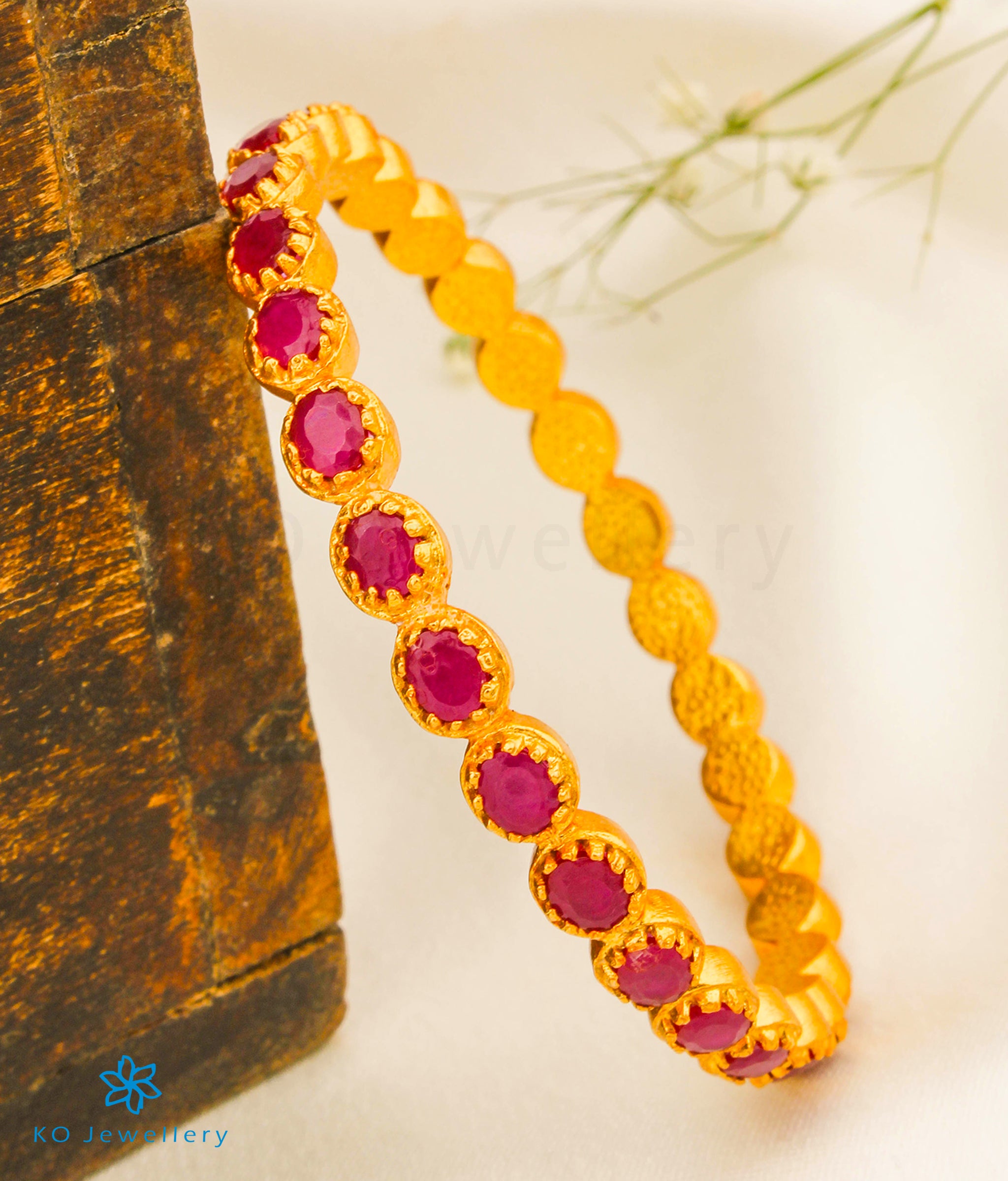 A pretty bangle in an attractive red colour, this makes a great accessory. Oval shaped red kemp stones come together in Sterling Silver (92.5%) to create this exclusive piece. This seamlessly handcrafted bangle can be bought as a single piece or in a pair. The price listed is for a single bangle.