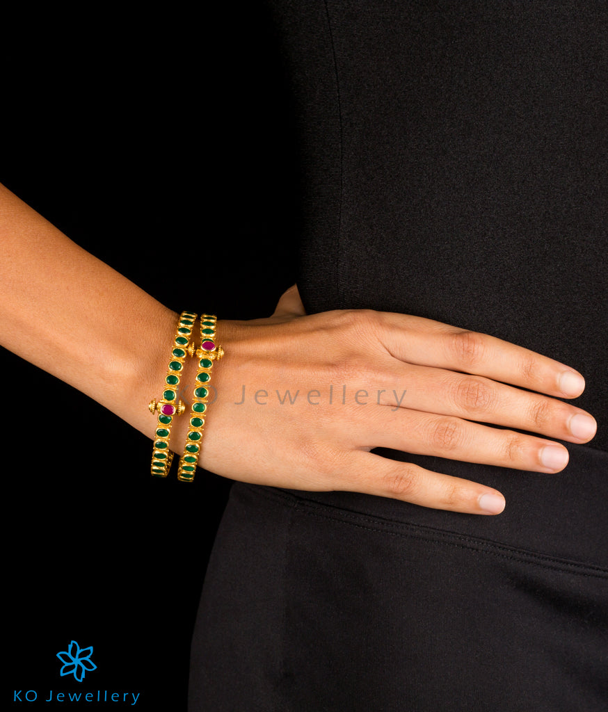 Let your hands soak all the attention when you wear this gorgeous bracelet in green. Beautiful oval-shaped green stones are framed in Sterling Silver (92.5%) to create this exclusive piece. This seamlessly handcrafted bracelet can be opened to gently fit your hand. You could choose to buy it single or in a pair. The price listed is for a single bangle.