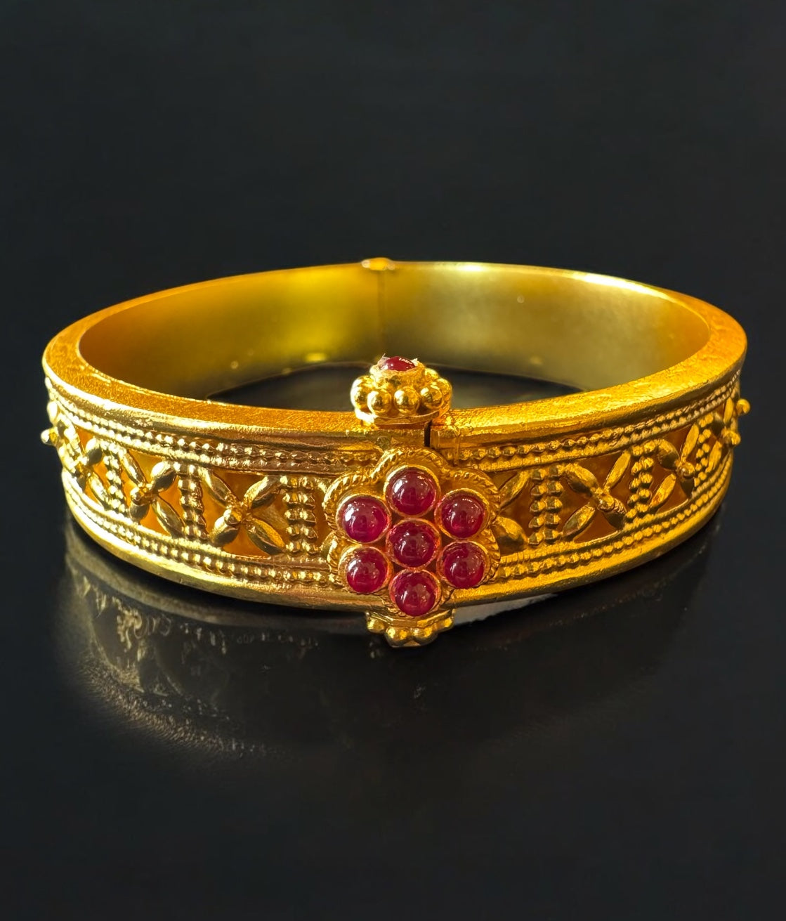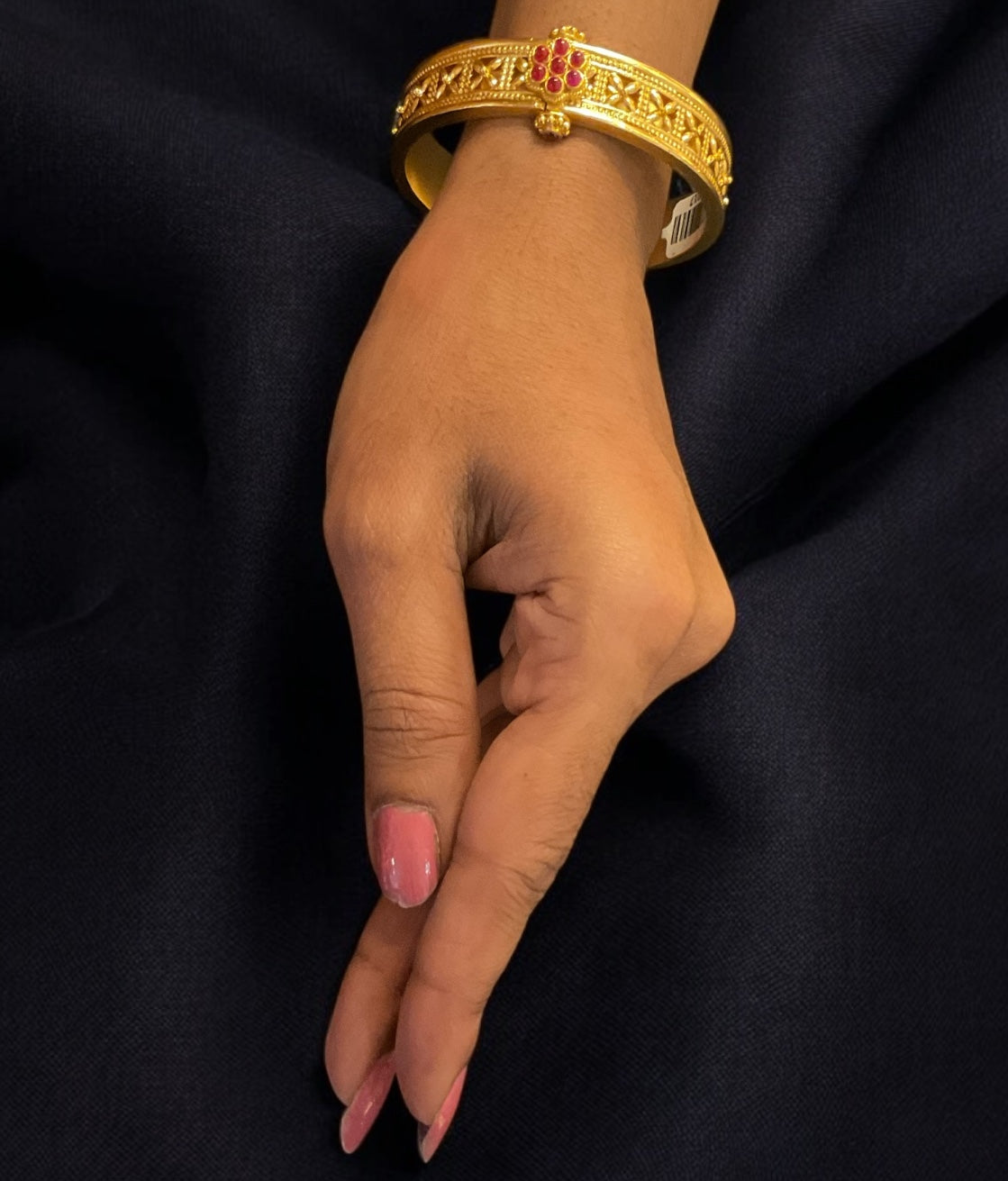 Handmade using the age-old techniques of temple jewelry, each kada is a testament to superior craftsmanship, created with care and dedication. Whether worn for a special occasion or as a daily statement piece, this bracelet is sure to captivate with its beauty and craftsmanship.