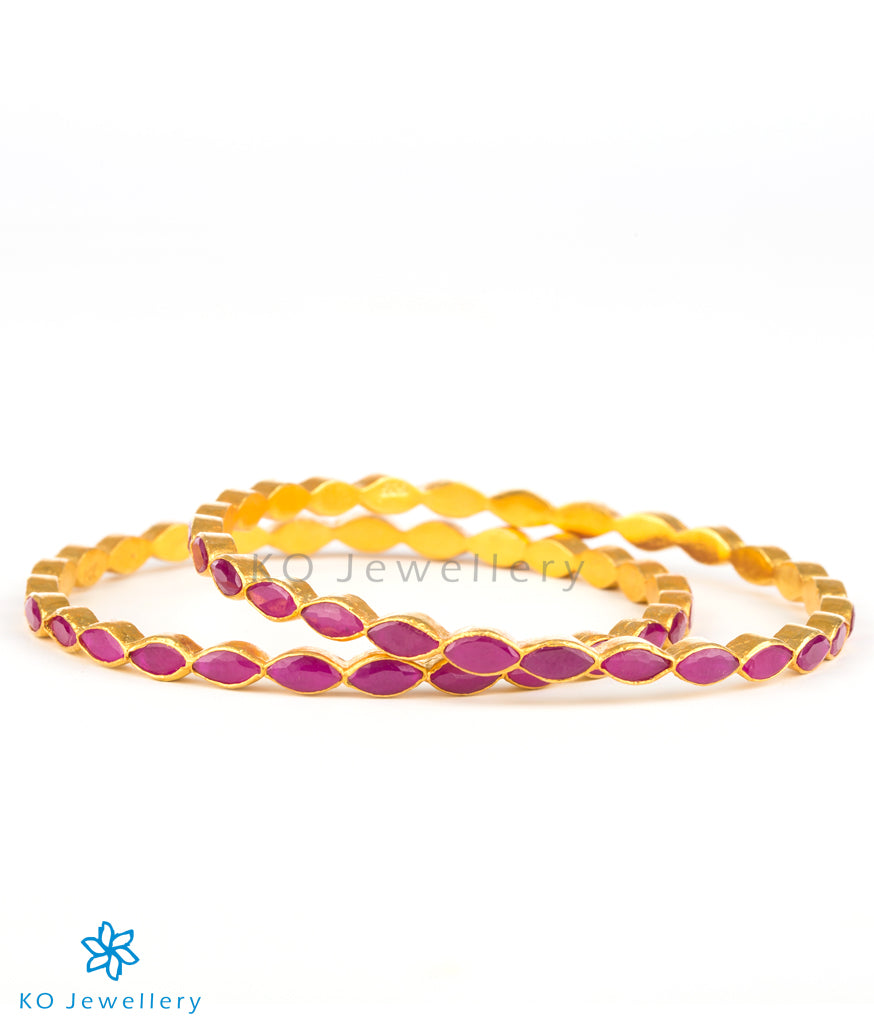 A Stunning bangle with marquis-shaped kempu stones , handcrafted in Sterling Silver (92.5%) . This seamlessly handcrafted bangle can be bought as a single piece or in a pair. The price listed is for a single bangle.