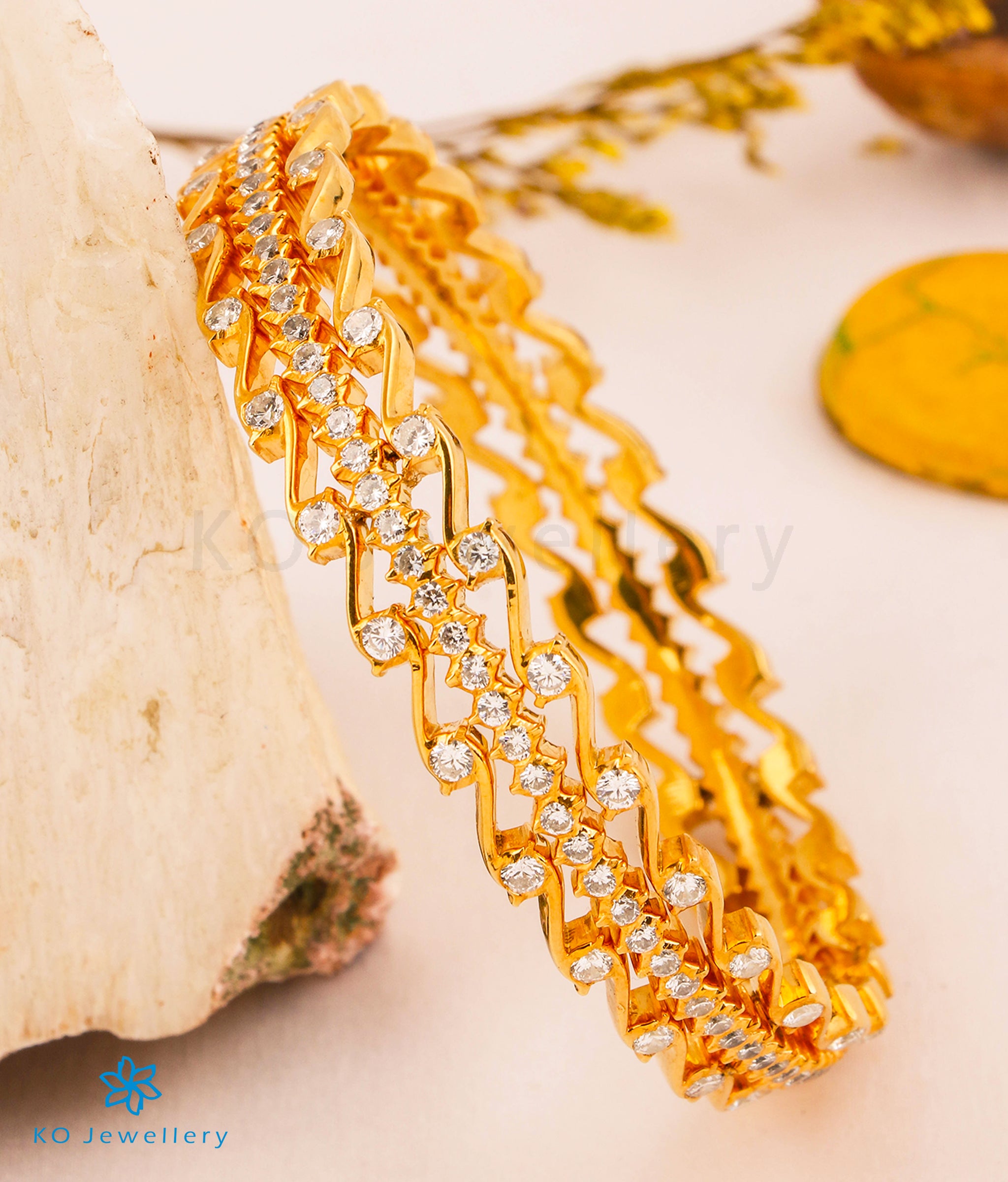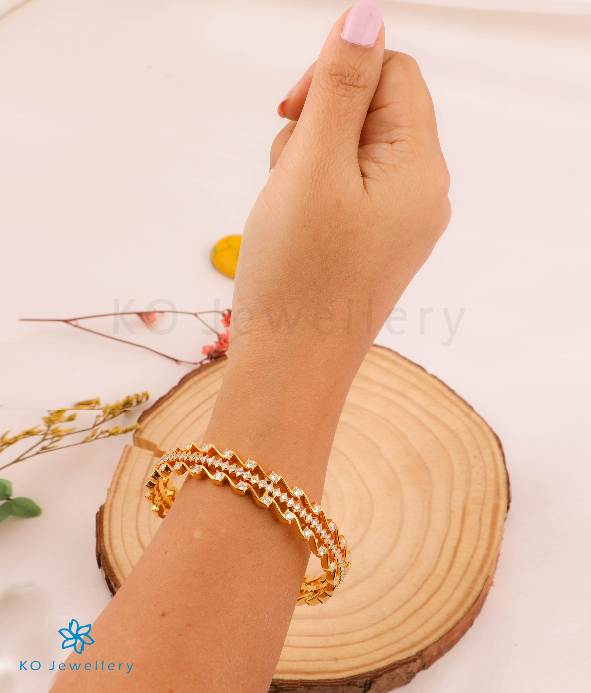 The bangle uses AAA+ Quality Cubic Zircon that gives it a sparkling shine. Handcrafted in Sterling Silver (92.5%) in a flawless pattern to mesmerise and awe us with its intricacies of design and flawless craftsmanship and gold-dipped in a special process . This seamlessly handcrafted bangle can be bought as a single piece or in a pair. The price listed is for a single bangle.