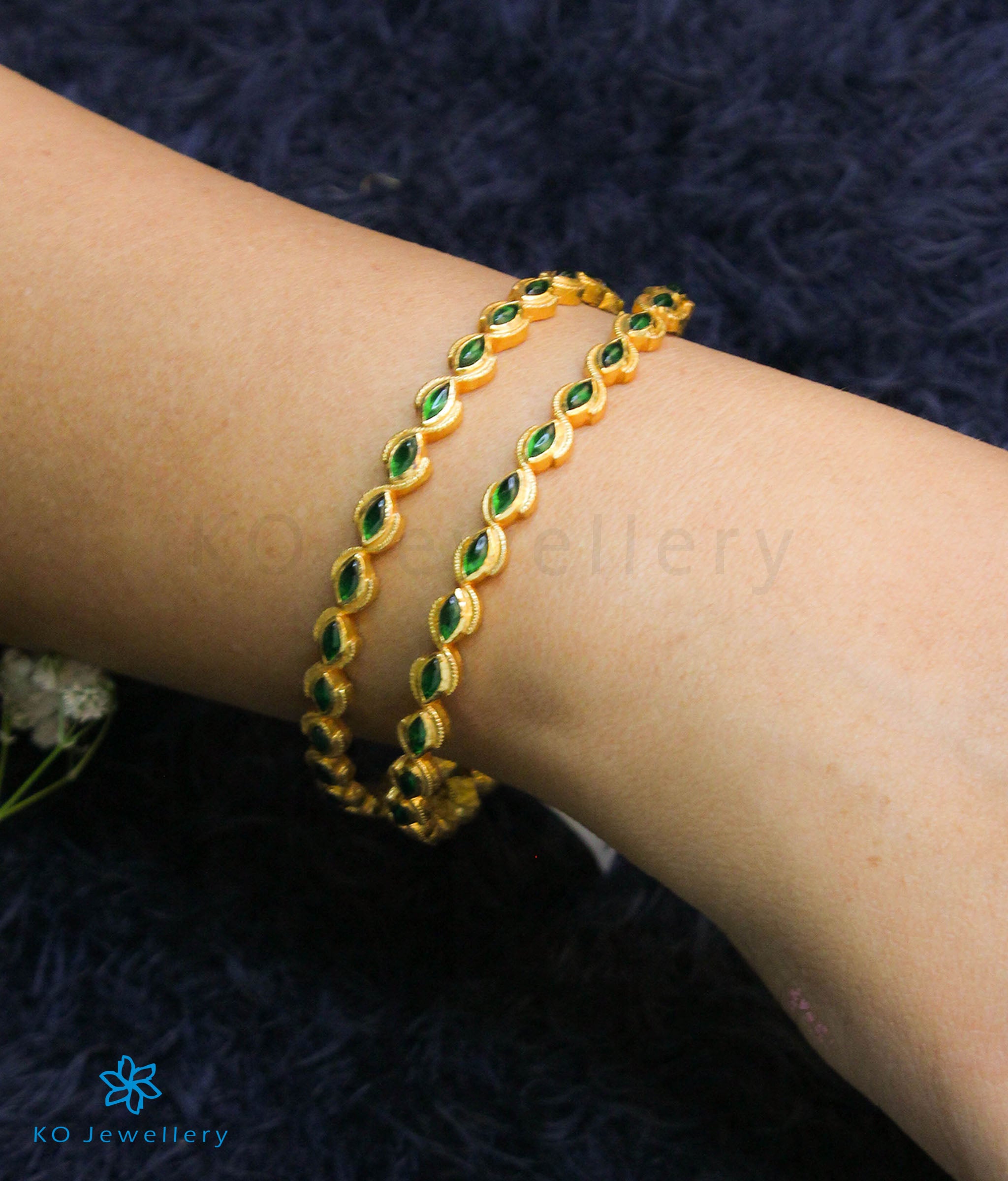 An attractive and delicate Sterling Silver (92.5%) bangle handcrafted to perfection to look graceful on every hand . The ornate design on the bangle is accentuated by green kempu stones .Buy a pair of these bangles to complement your ethnic wear this festive season. The price listed is for a single bangle.