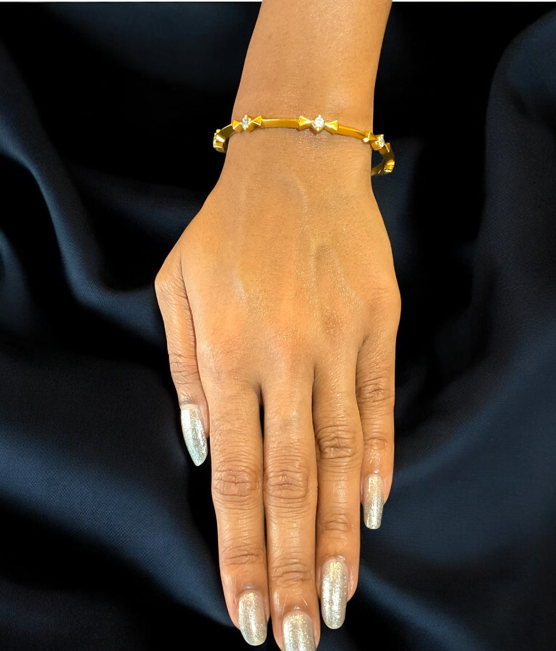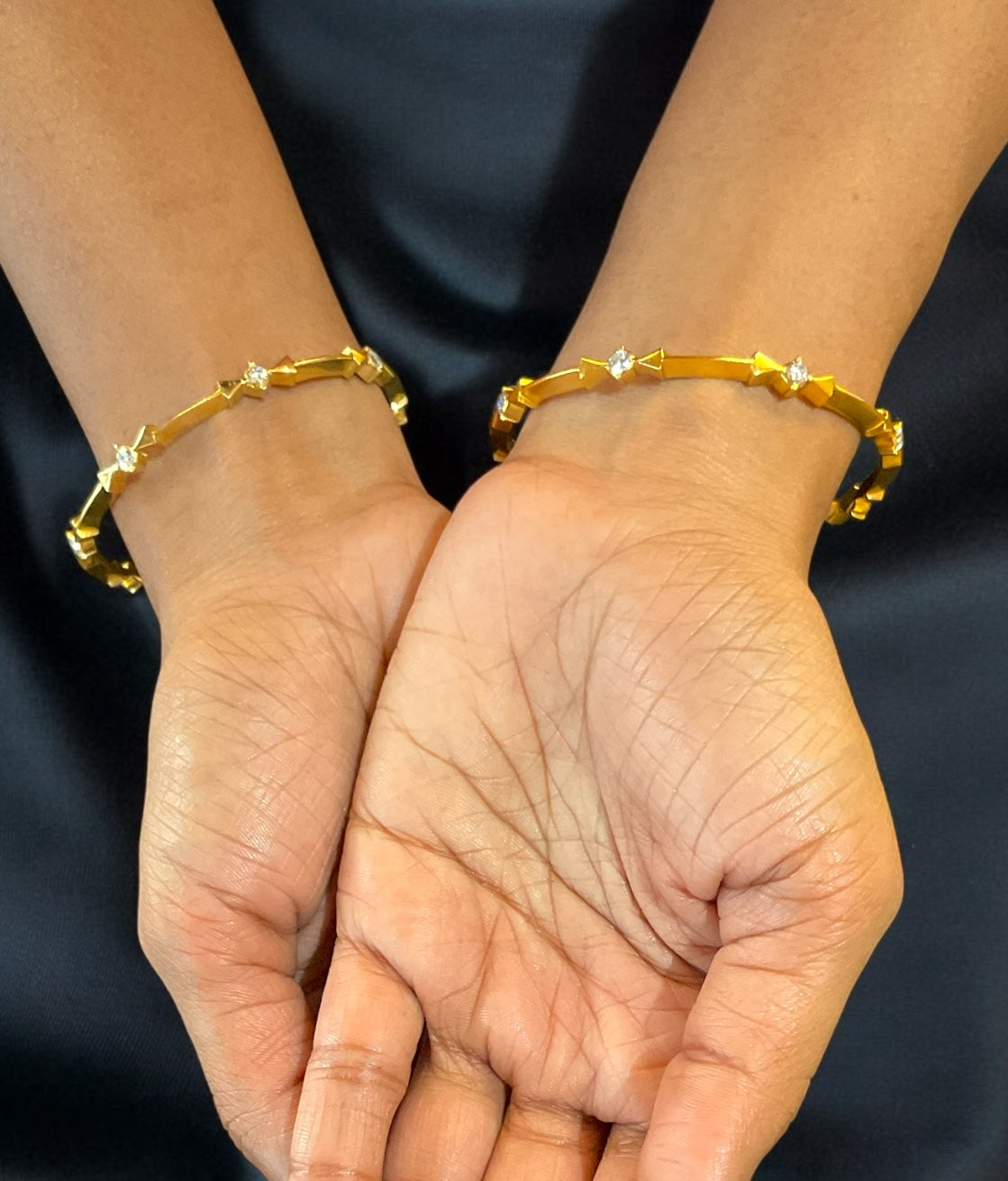 The bangle uses AAA+ Quality Cubic Zircon that gives it a sparkling shine. Handcrafted in Sterling Silver (92.5%) in a flawless pattern to mesmerise and awe us with its intricacies of design and flawless craftsmanship and gold-dipped in a special process . This seamlessly handcrafted bangle can be bought as a single piece or in a pair. The price listed is for a single bangle.