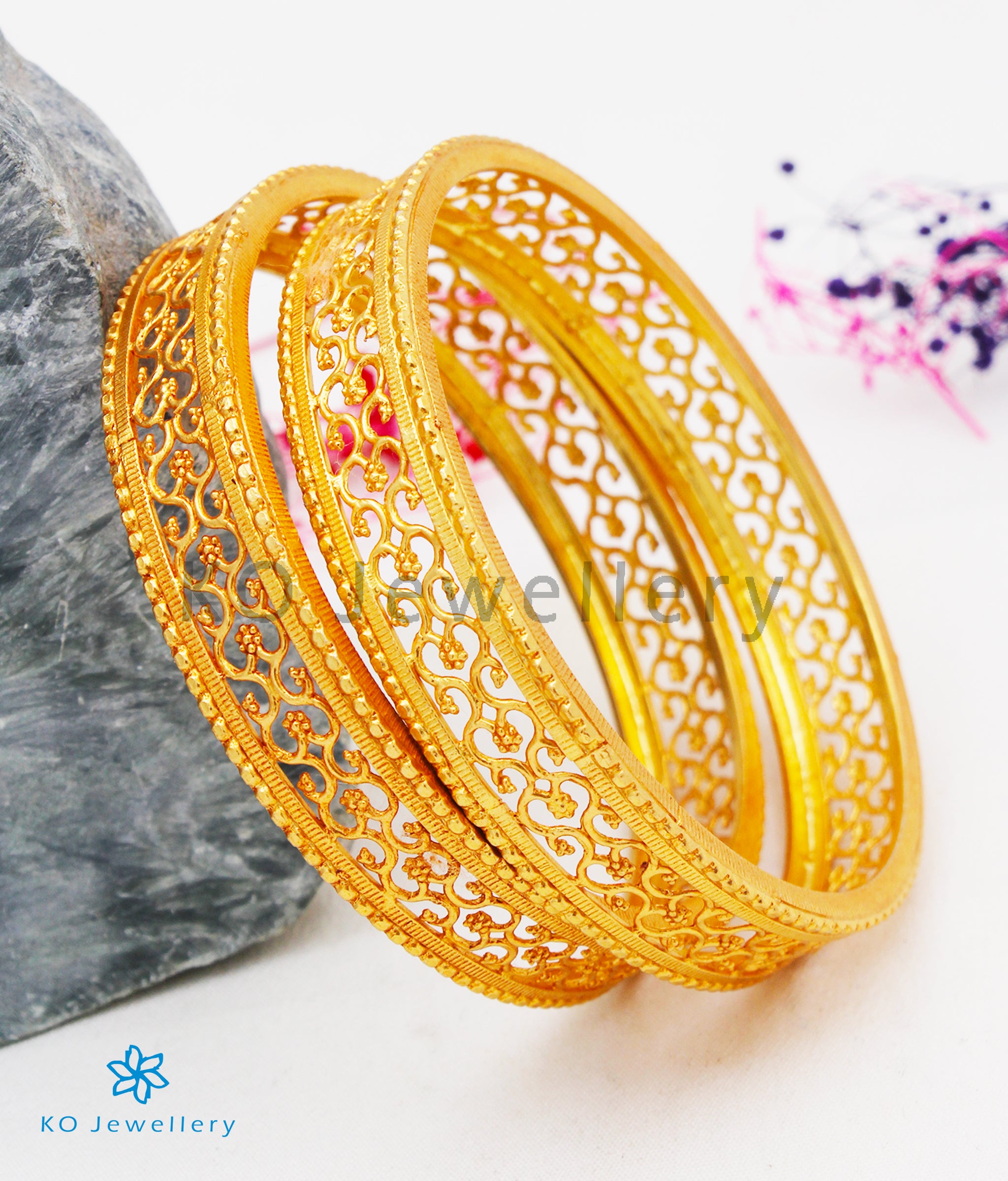 An attractive Sterling Silver (92.5%) gold-dipped, bangle with intricate filigree work handcrafted to perfection to look graceful on every hand .The ornate design on the bangle is extremely attractive. The price listed is for a single bangle.