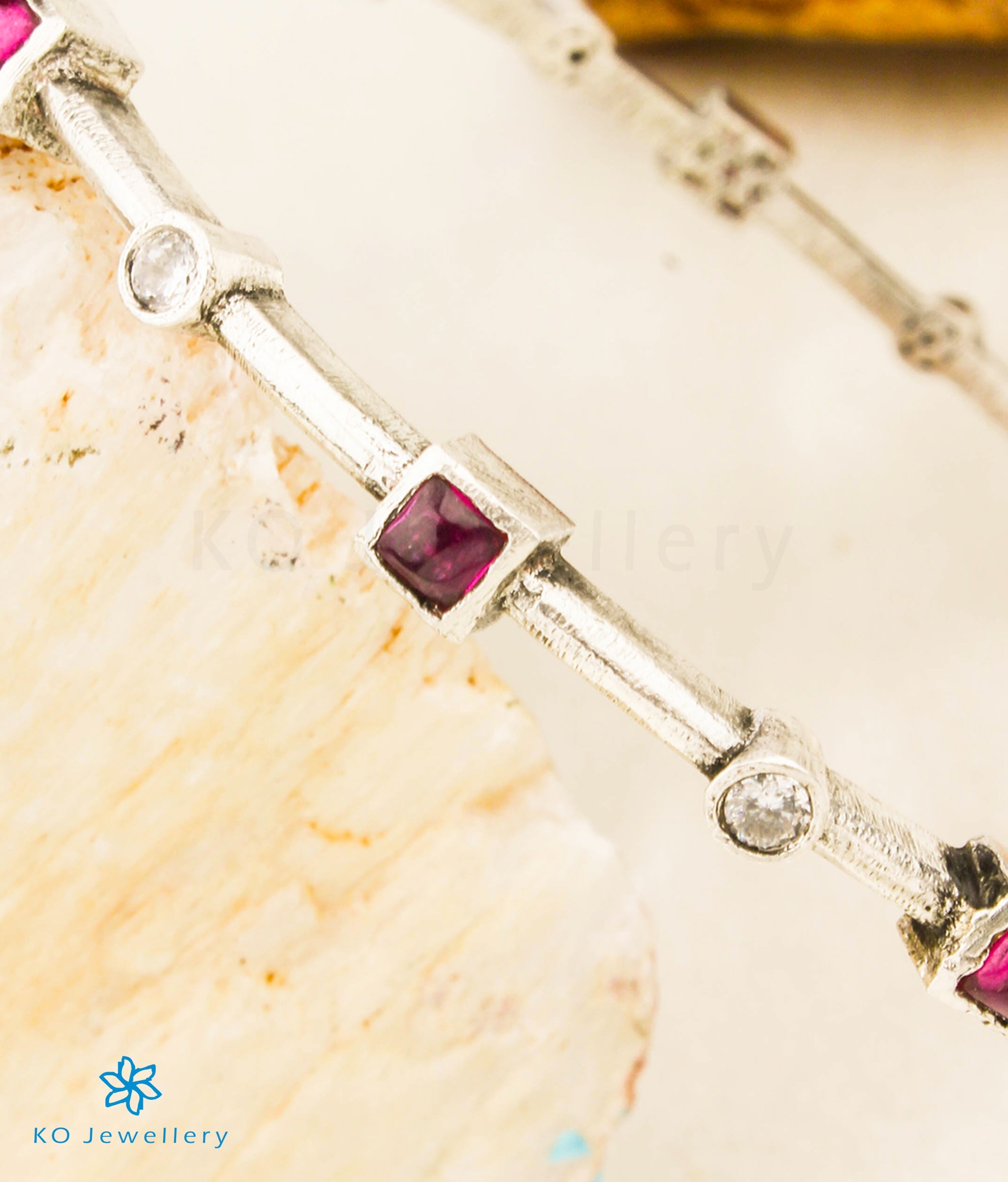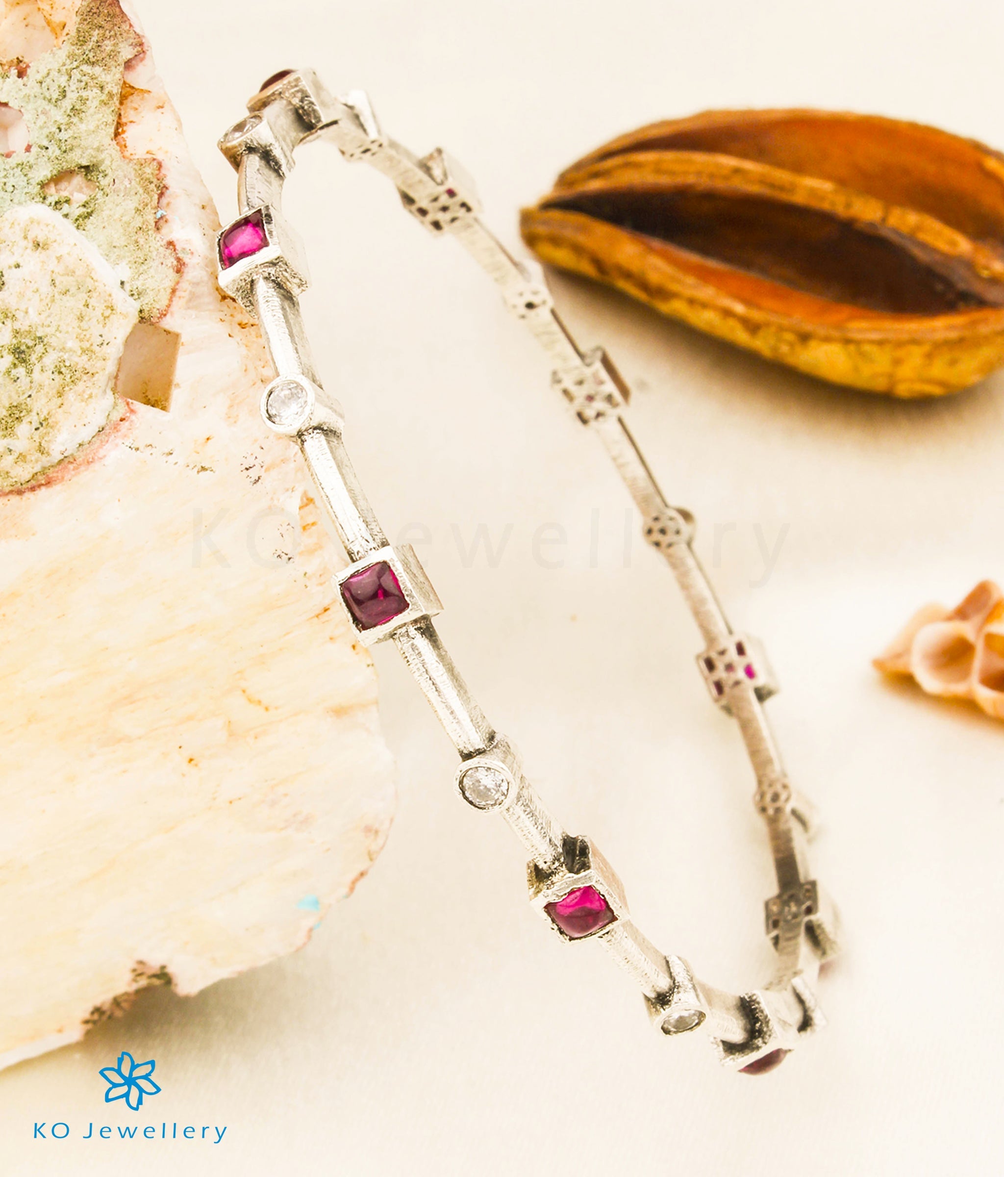 Let your hands soak all the attention when you wear this gorgeous bangle with tiny kempu stones.Handcrafted in Sterling Silver (92.5%) this is an understated and elegant design. This seamlessly handcrafted bangle can be bought as a single piece or in a pair. The price listed is for a single bangle.