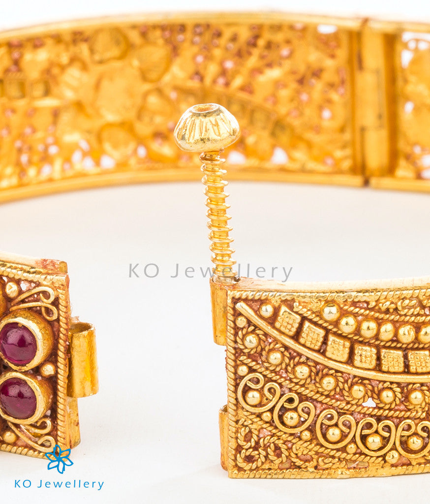 A pretty bracelet, with intricate filigree-work ,complex design and attractive colour. Handcrafted with care in pure Sterling Silver (92.5%) and gold-dipped this piece will keep the attention on you! .This is a kada with a screw that can be opened.