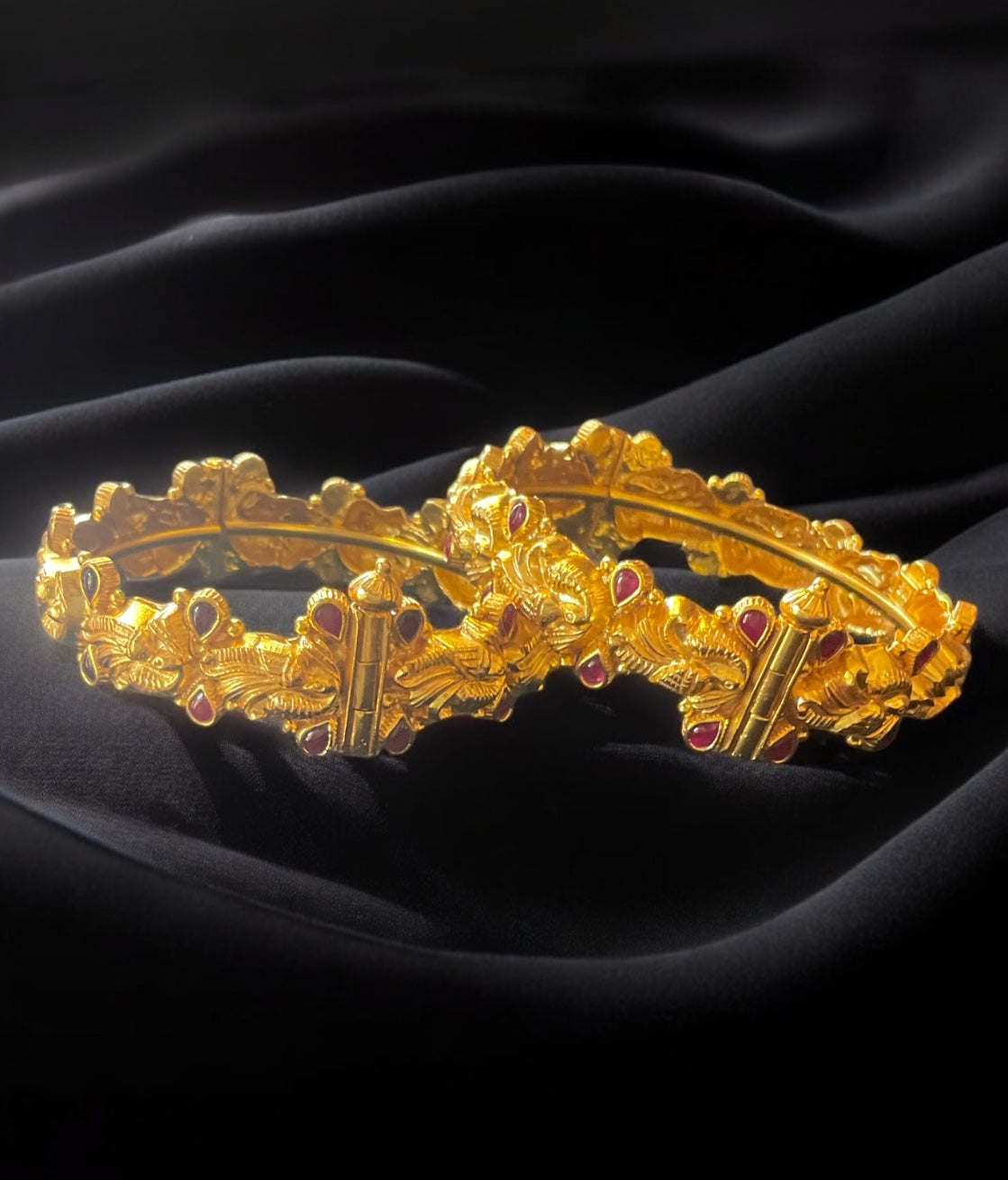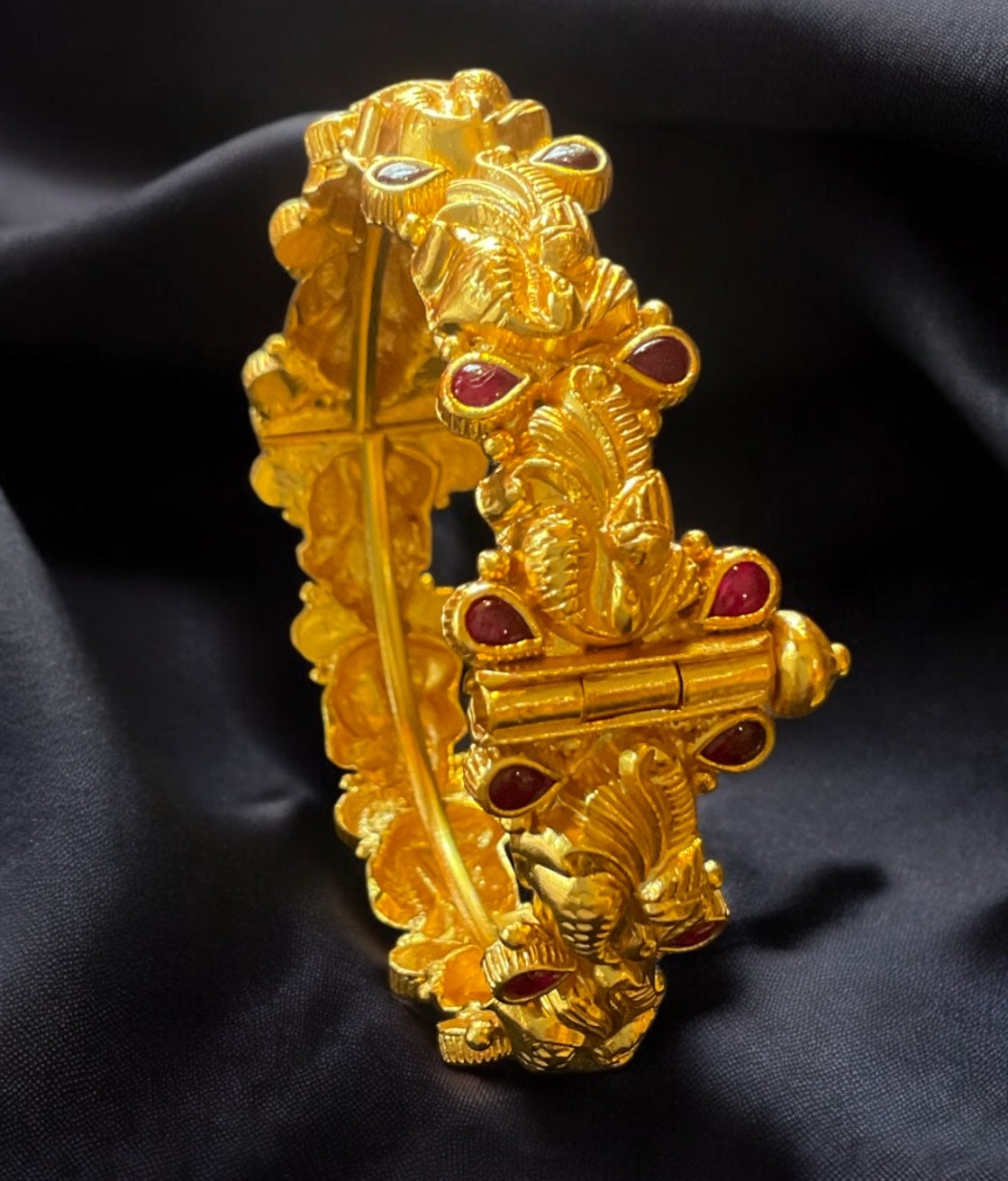 Each intricate detail is brought to life through painstaking craftsmanship, showcasing the finest nakshi (nakkasi) work. The kada is further accentuated with radiant kempu stones, adding a touch of regal charm and color. 24K gold plating gives it a rich, authentic finish that closely resembles real gold, making it perfect for traditional occasions, weddings, or festive celebrations.