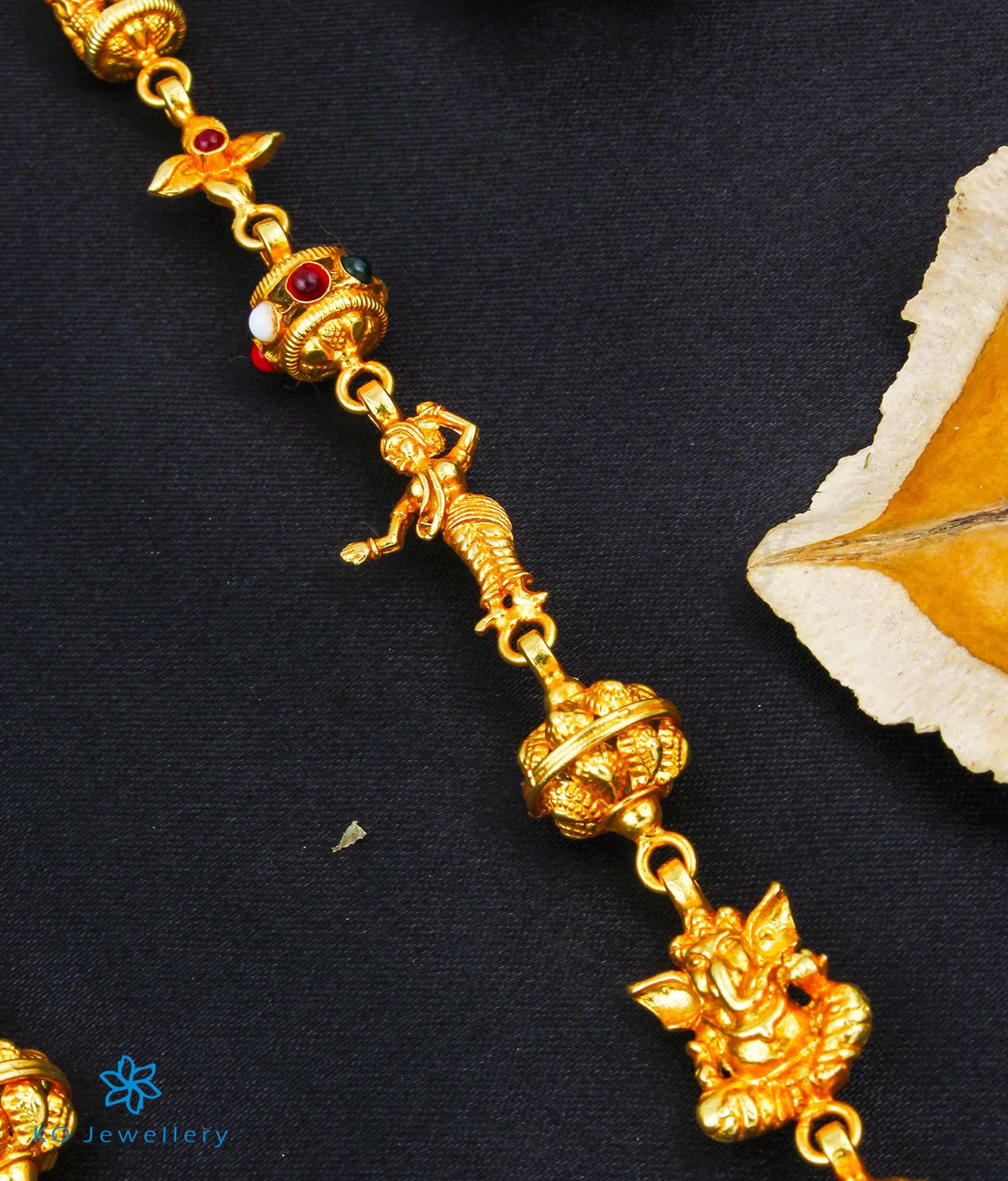 This chain is made up of gold-dipped, Sterling Silver (92.5%) beads that are decorated with navratna gemstones and Ganesha as well as dancing apsara motifs. Handcrafted in various intricate designs this is a stunning piece of jewellery. You can wear this chain alone, to complement any outfit you can also pair it with different design pendants from our collection to make a ornate set.