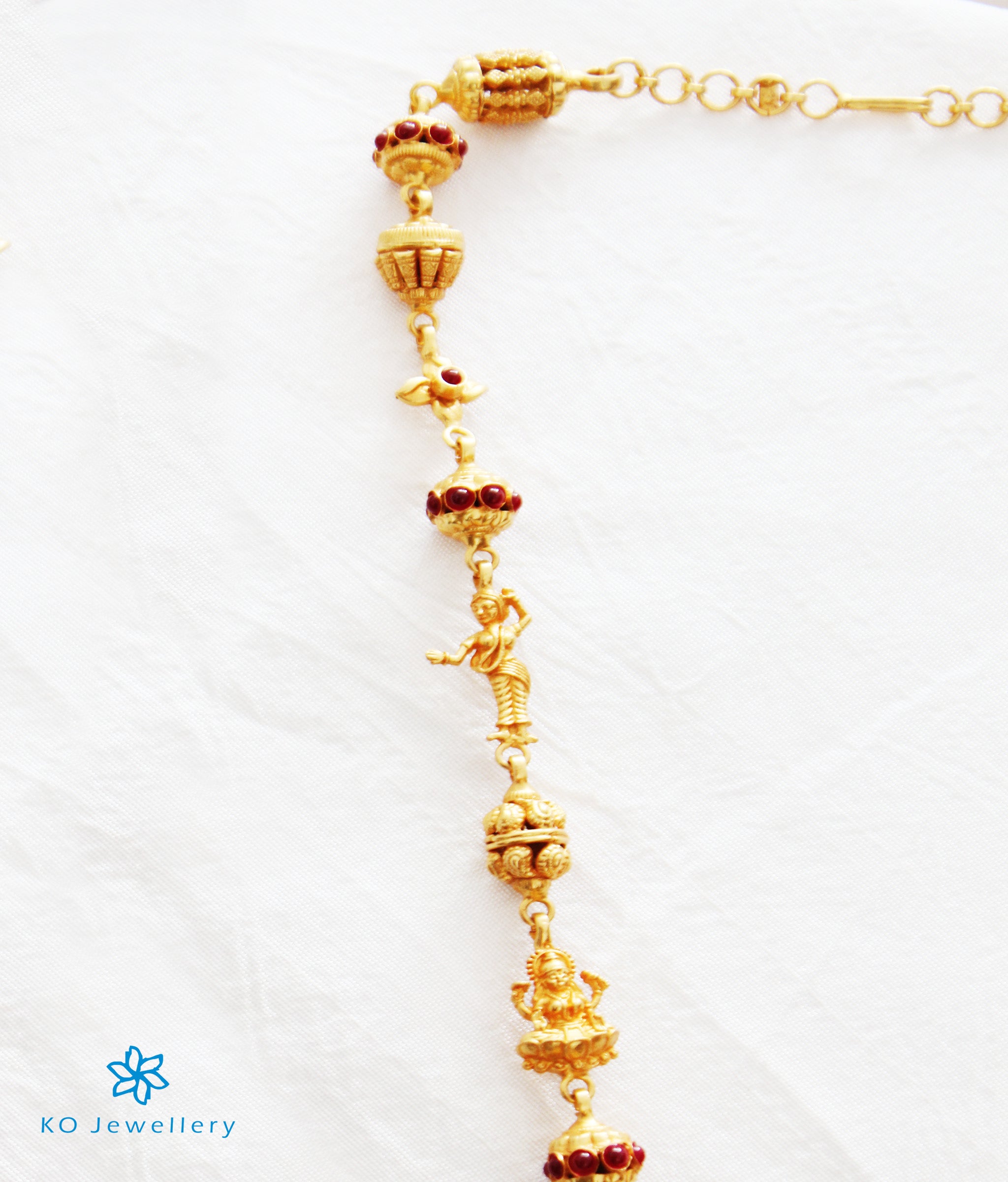 This chain is made up of gold-dipped, Sterling Silver (92.5%) beads and Lakshmi and a few apsara motifs. Handcrafted in various intricate designs this is a stunning piece of jewellery.