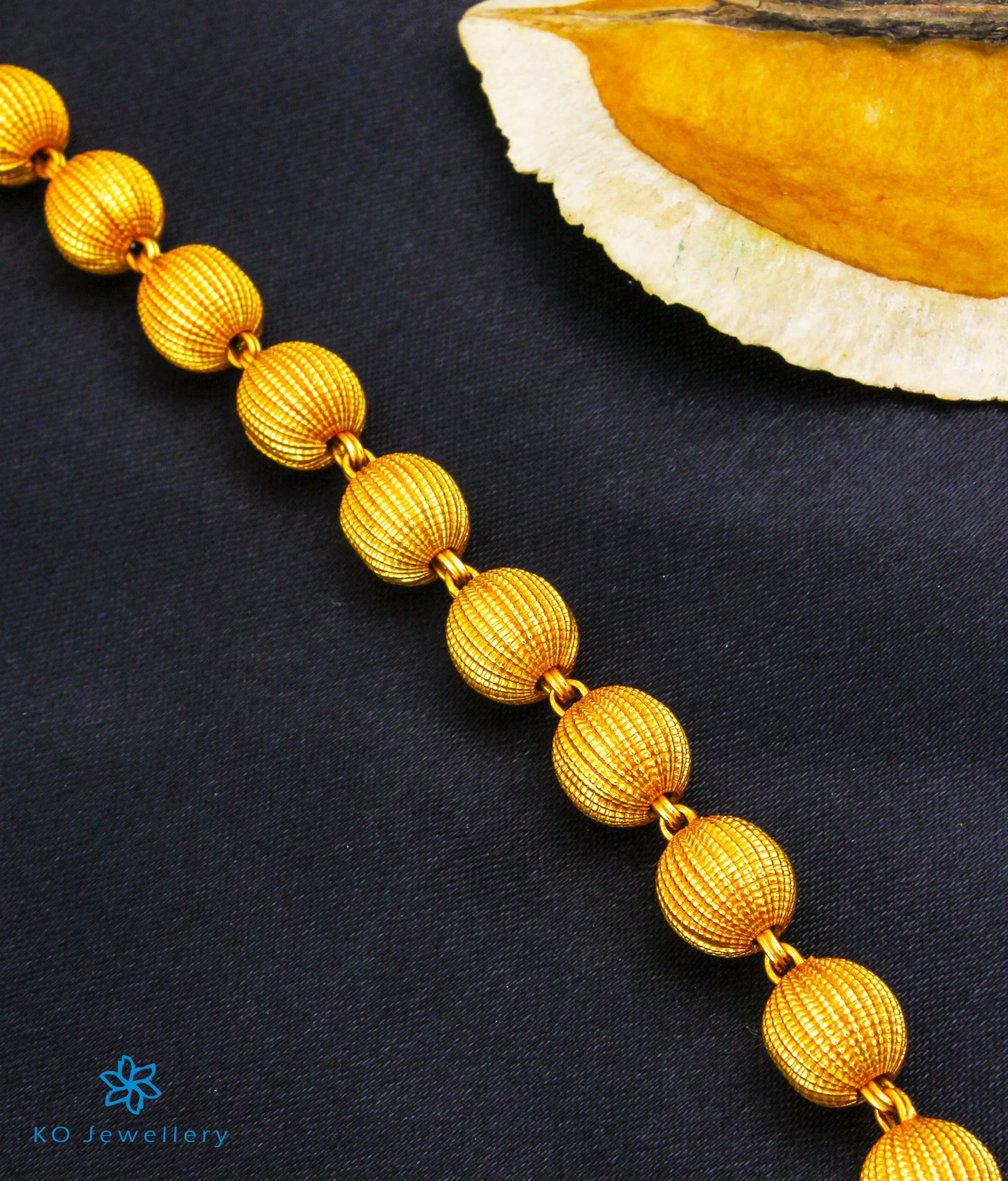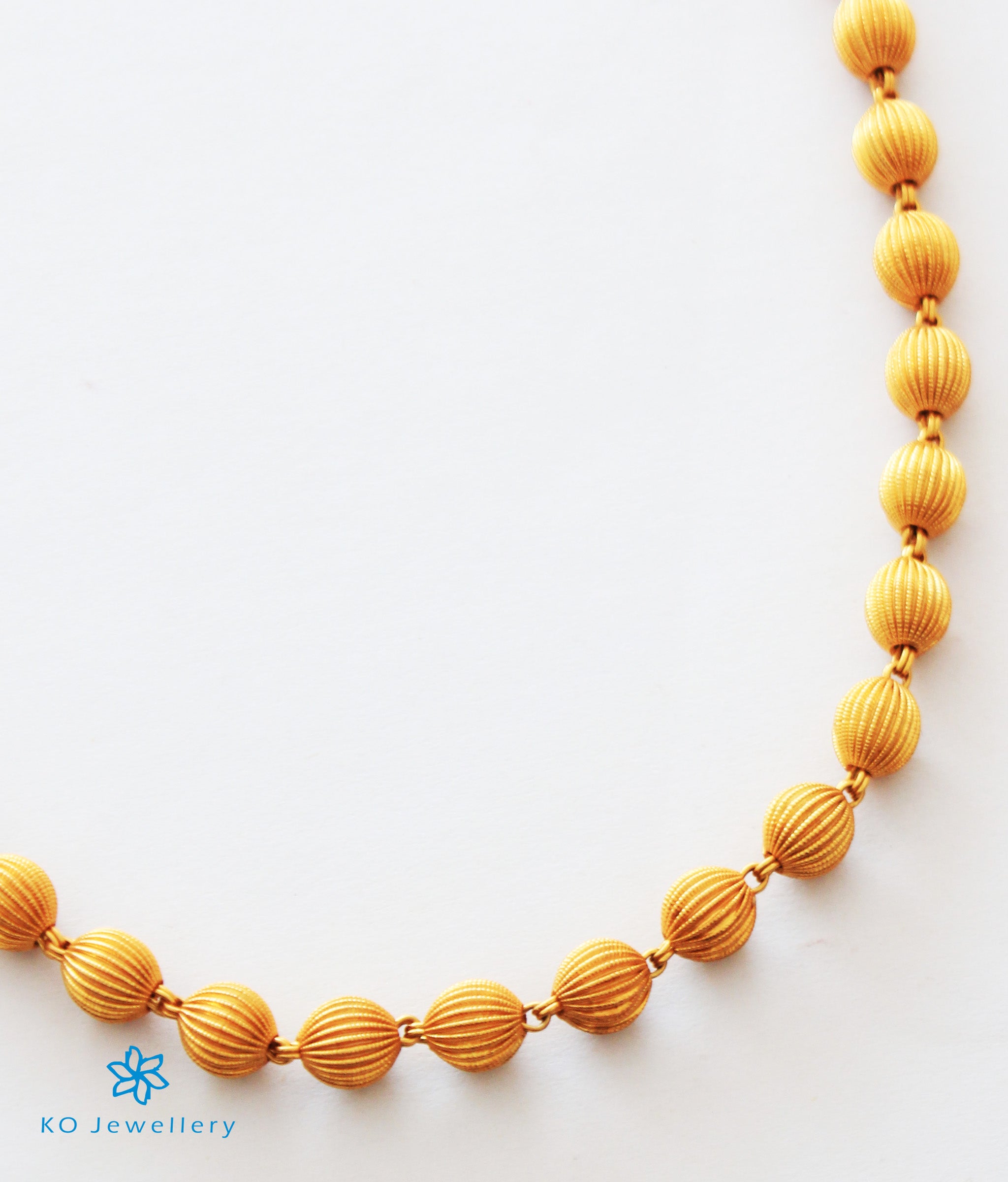 This chain made up of gold-dipped, silver beads ( which have a unique ribbed design or grooves) is a traditional centuries old ornament worn by women in south India. It is also called Nellikai mani, Nellikaisara .