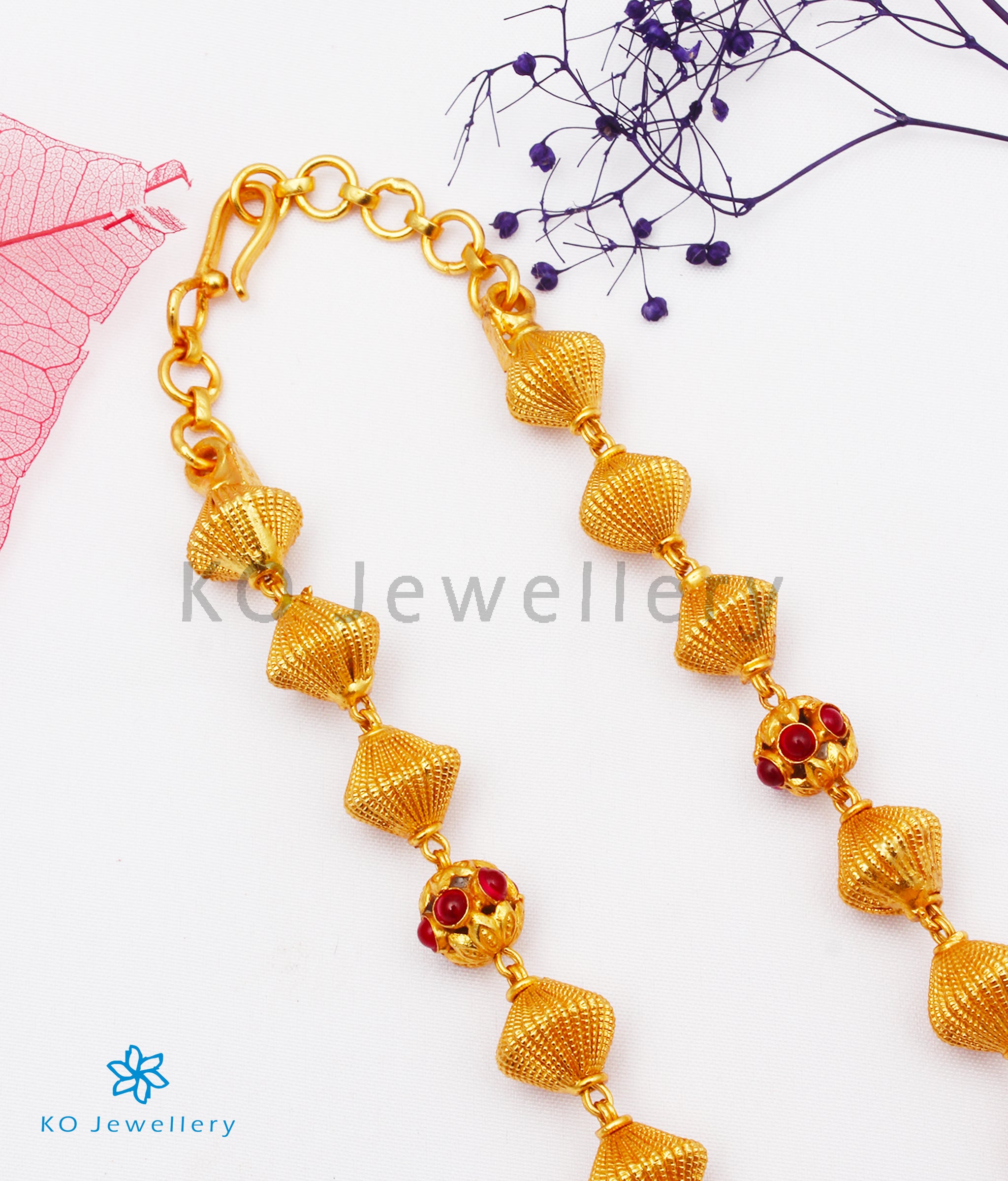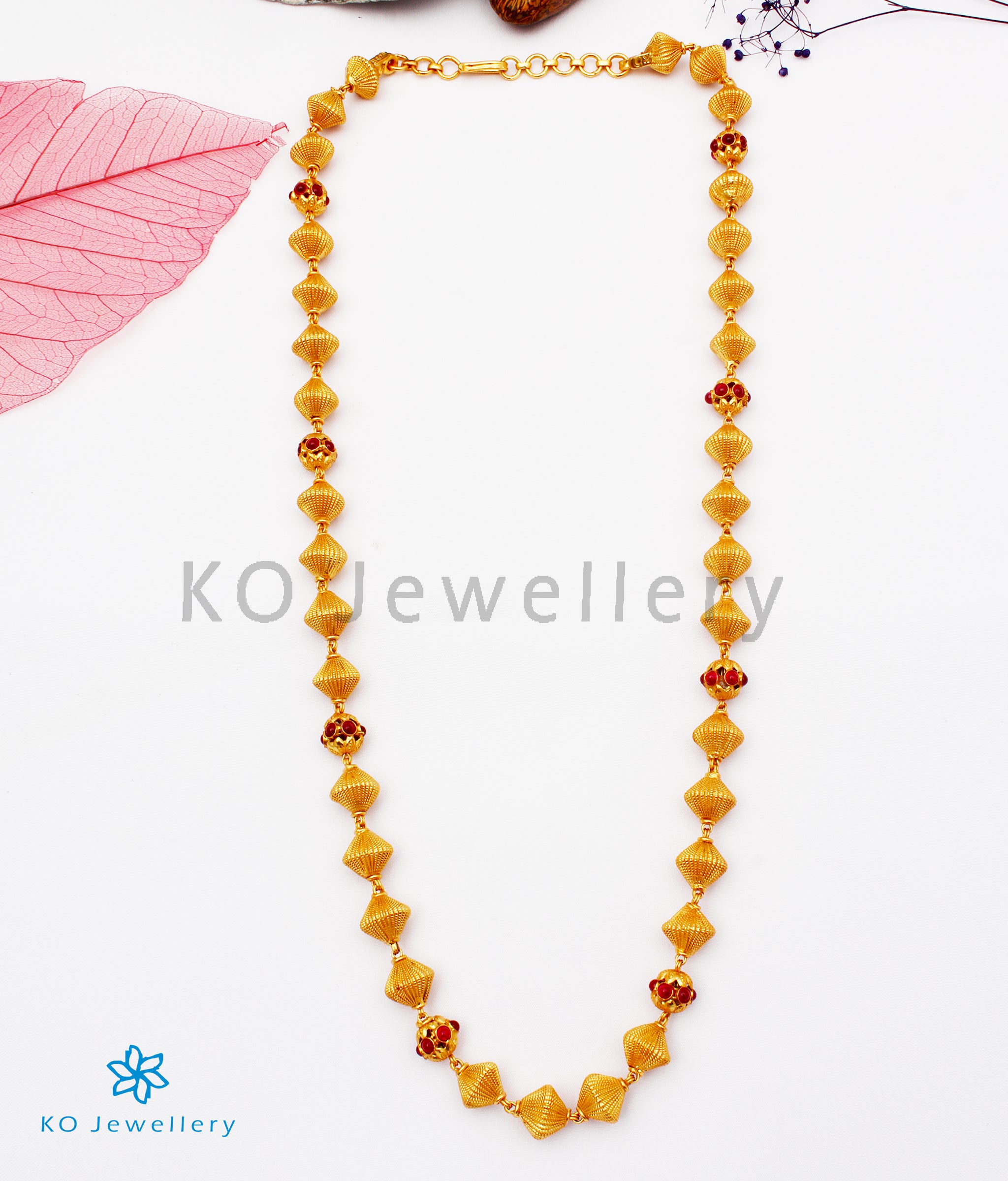 This chain made up of gold-dipped, silver beads ( which have a unique ribbed design or grooves) is a traditional centuries old ornament worn by women in south India. It is also called Nellikai mani, Nellikaisara .