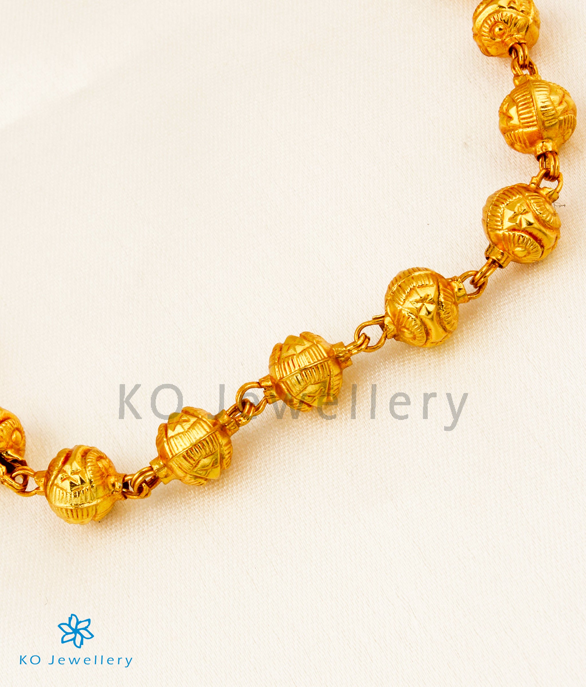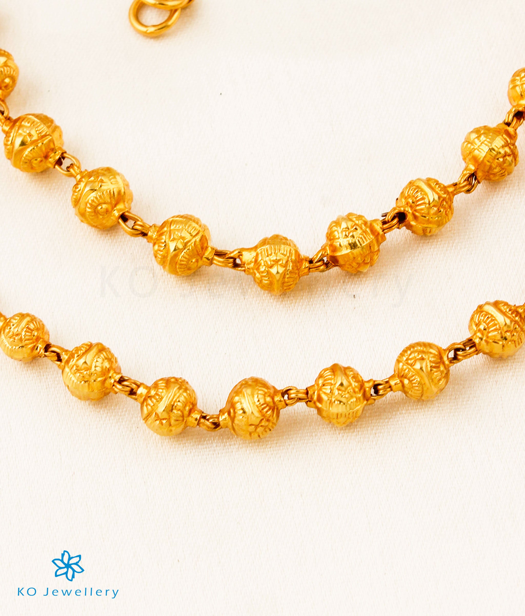 This chain made up of gold-dipped, Sterling Silver (92.5%) beads called Mohanmale which is a traditional centuries old ornament worn by women in south India.The beads have a unique floral design and are handwoven in silver wire and dipped in 24 karat gold and have been arranges in an ascending or graduated order from small to big beads.