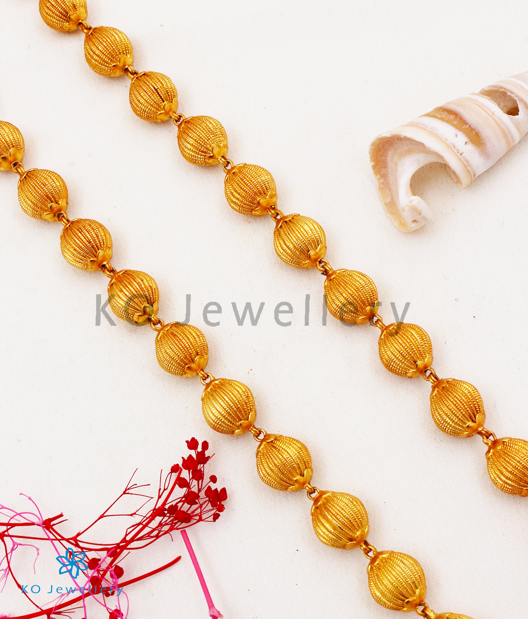 This chain made up of gold-dipped, silver beads ( which have a unique ribbed design or grooves) is a traditional centuries old ornament worn by women in south India. It is also called Nellikai mani, Nellikaisara .