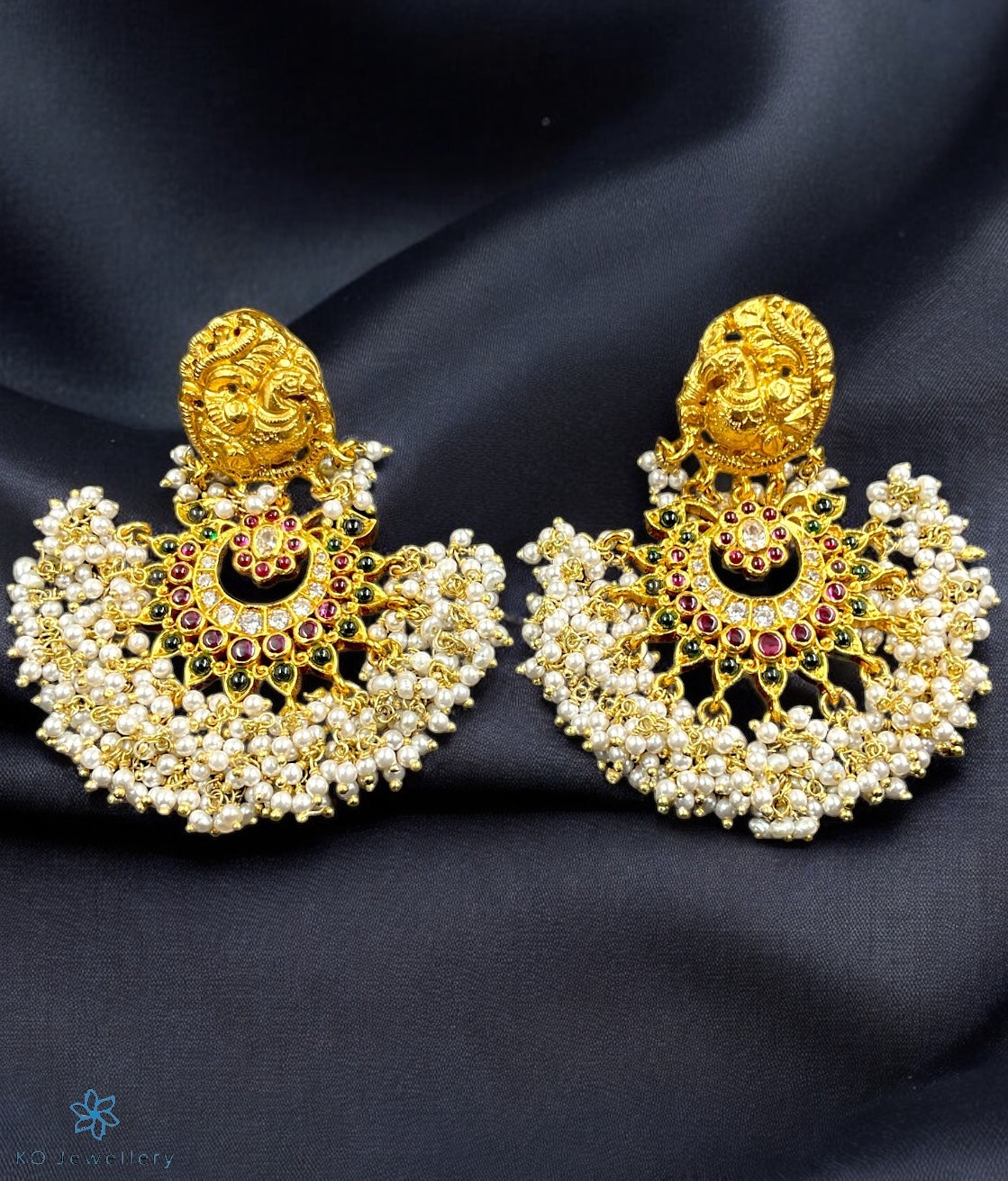 This is an exquisite pair of earrings that have been finely crafted using the South Indian temple gold jewellery techniques. Two peacocks adorn an intricate golden frame that encloses a design of blooming flowers . Tastefully used white and green kempu stones further accentuate the design handcrafted from Sterling Silver (92.5%). Pair it with a traditional dress to stand out from the crowd. The earrings come in screw back (or bombay screw) closure .