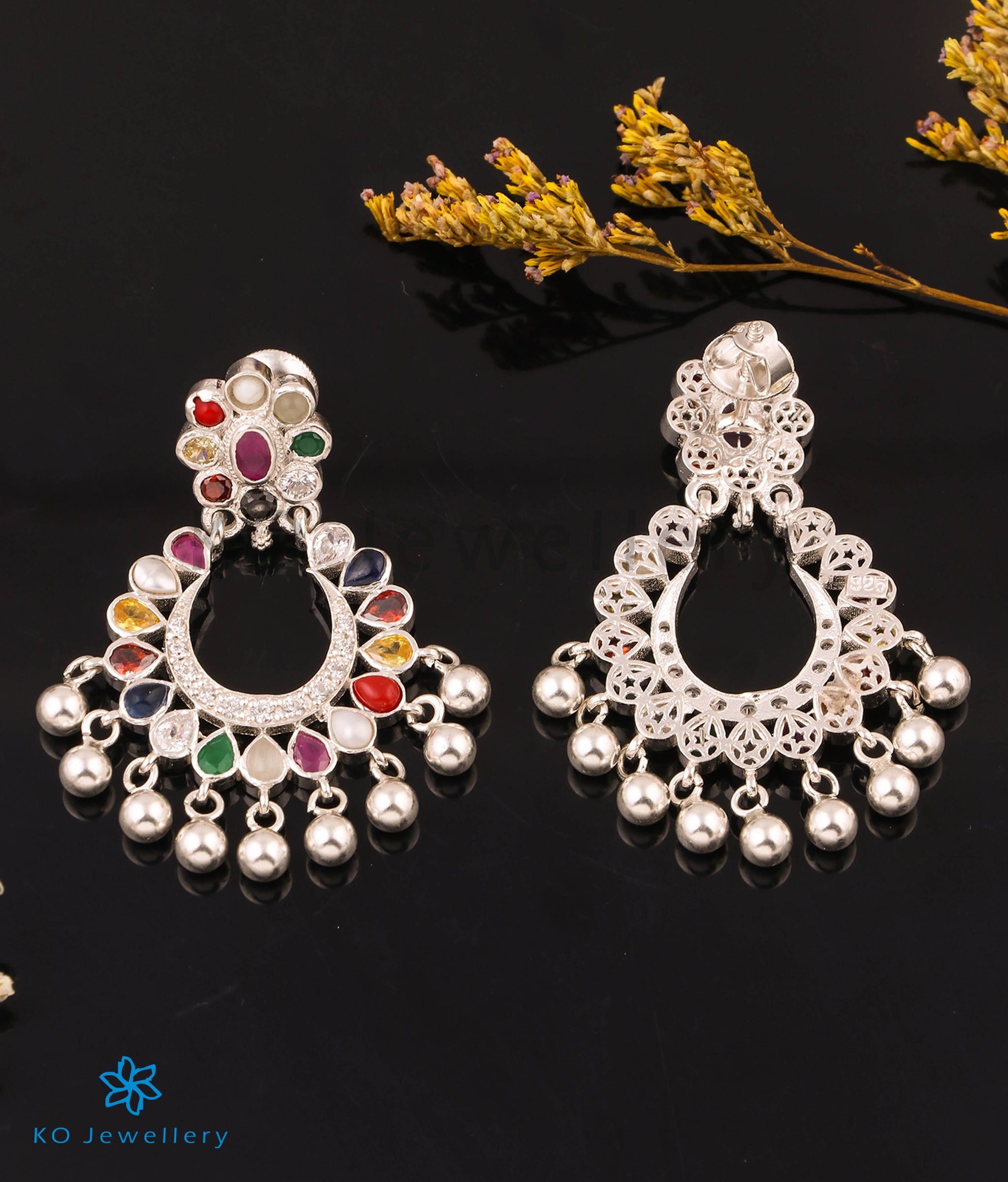 The Meghana antique Silver Navratna Chand bali-Buy Silver Statement Jewellery - KO Jewellery