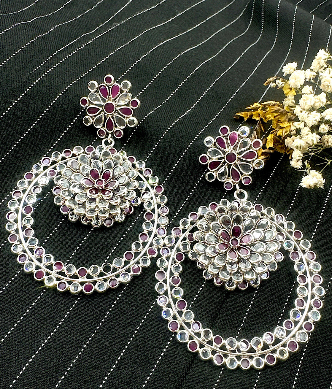 Bespoke and attractive these sterling silver (92.5%) statement earrings will brighten up any outfit. Skillfully handcrafted using red and white polki stones set in a "bezel setting" , this allows the stones to sparkle and shine brilliantly. The contemporary design and colour means that you can pair these earrings with western and Indian outfits. The earrings come with a push back closure.