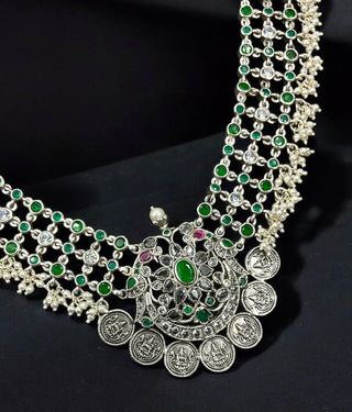 The Pratha Antique Silver Lakshmi Kasumala Coin Necklace/Waistbelt (Green)
