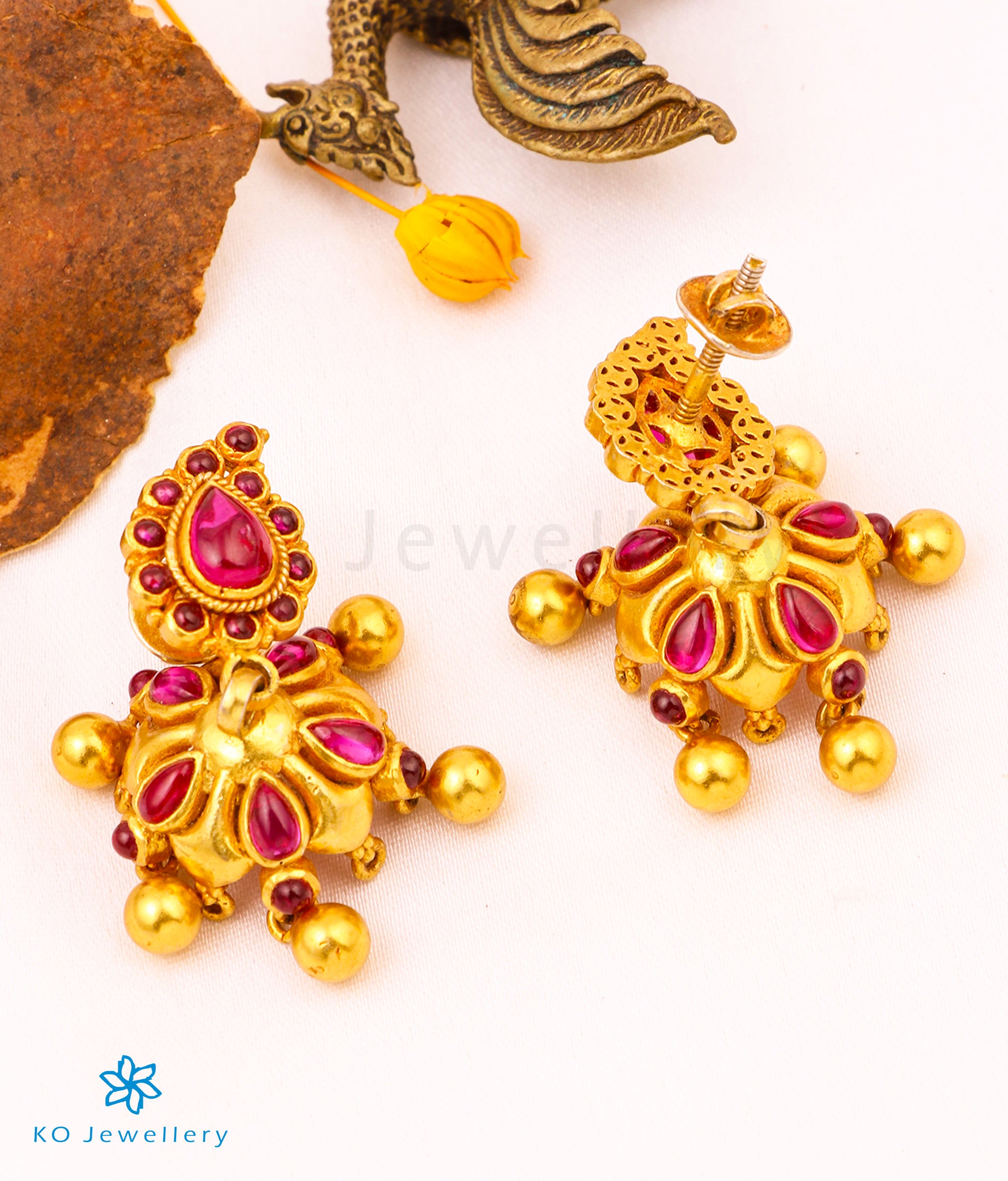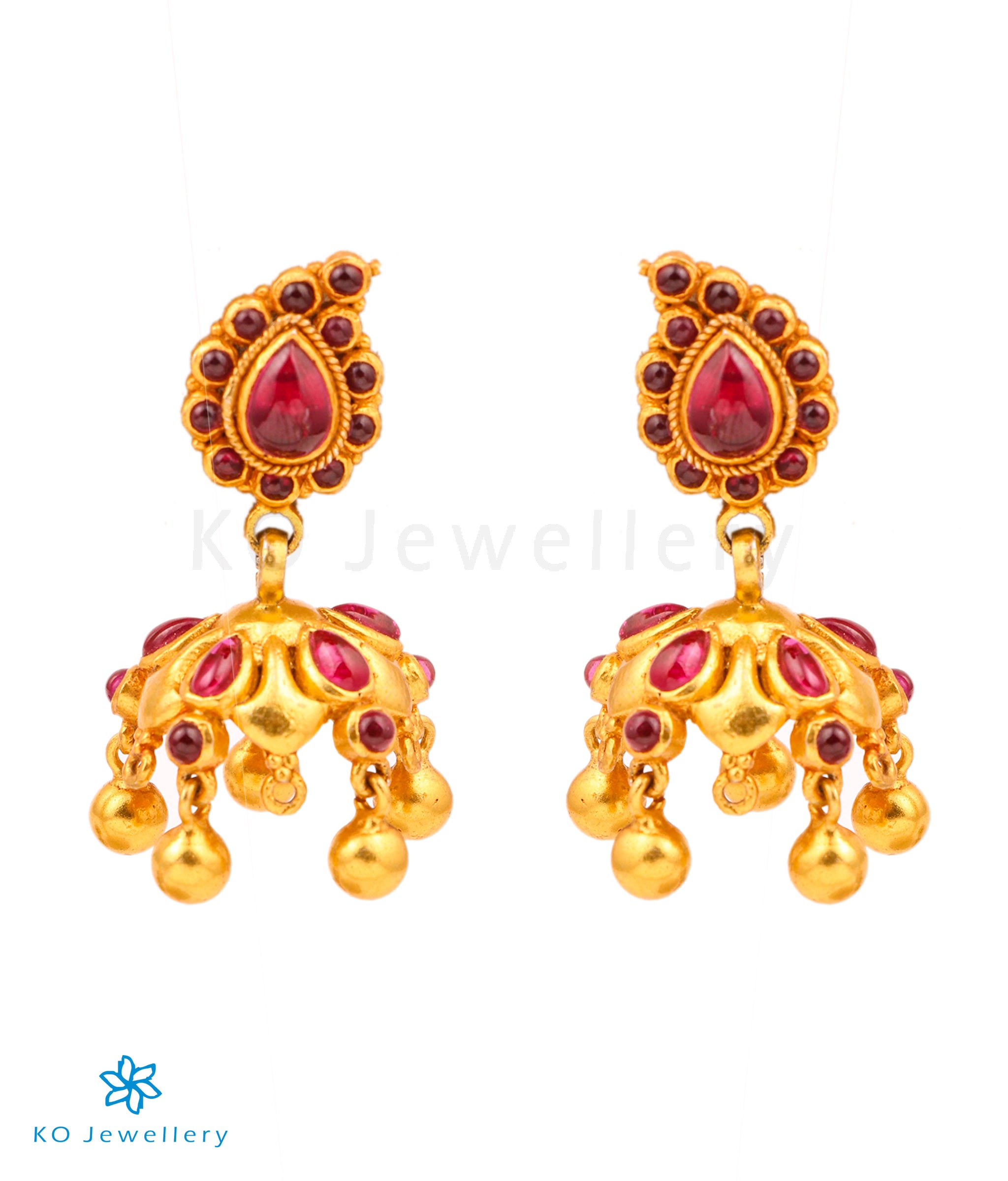 A beautiful kempu stone jhumka , the antique gold-dipped finish gives it an irresistable charm. Crafted using technqk jhuues used in ancient South Indian antique gold temple jewellery the entire piece is crafted in Sterling Silver (92.5%) silver .