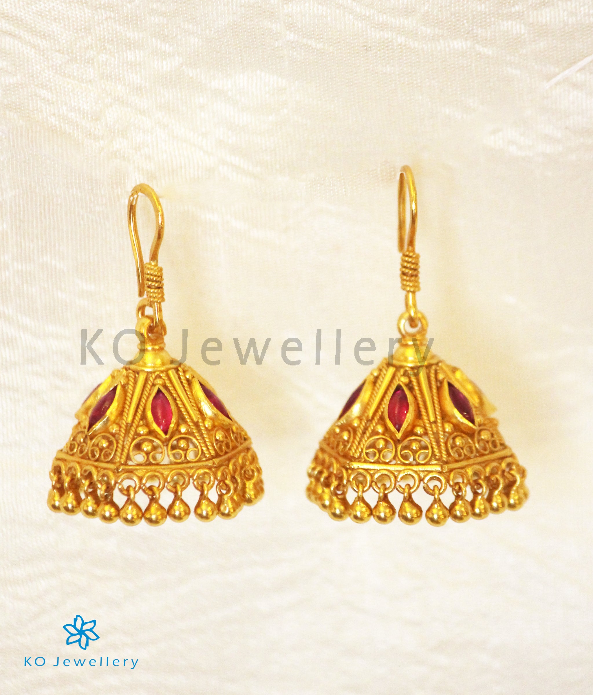An ornate jhumka featuring intricate silver work with kempu stones .Handcrafted from Sterling Silver (92.5%), these jhumkas are a beautiful mix of tradition and Indian craftsmanship. It will look gorgeous with your favourite sari or traditional dress.The jhumka has been gold-dipped to accentuate the design and comes with a hook.