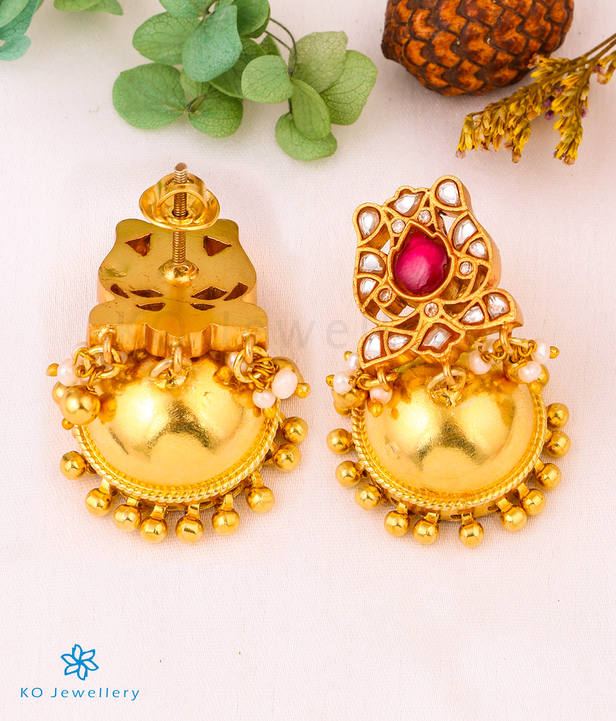 Bespoke and attractive these gold-dipped sterling silver (92.5%) jhumkas with red polki stones will brighten up any outfit. The contemporary design and colour makes them a perfect match for your ethnic outfits. The jhumkas come with a screw back closure.