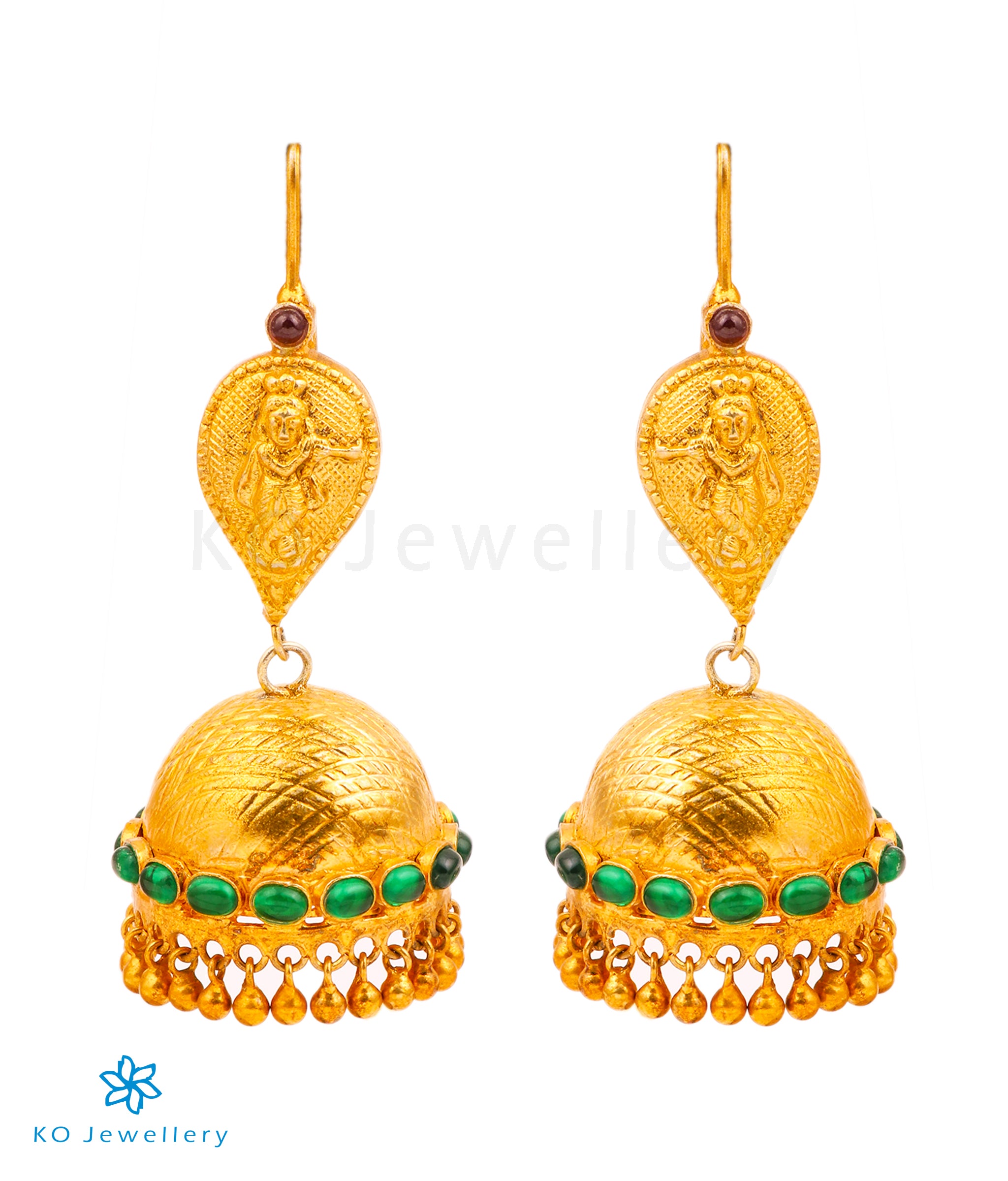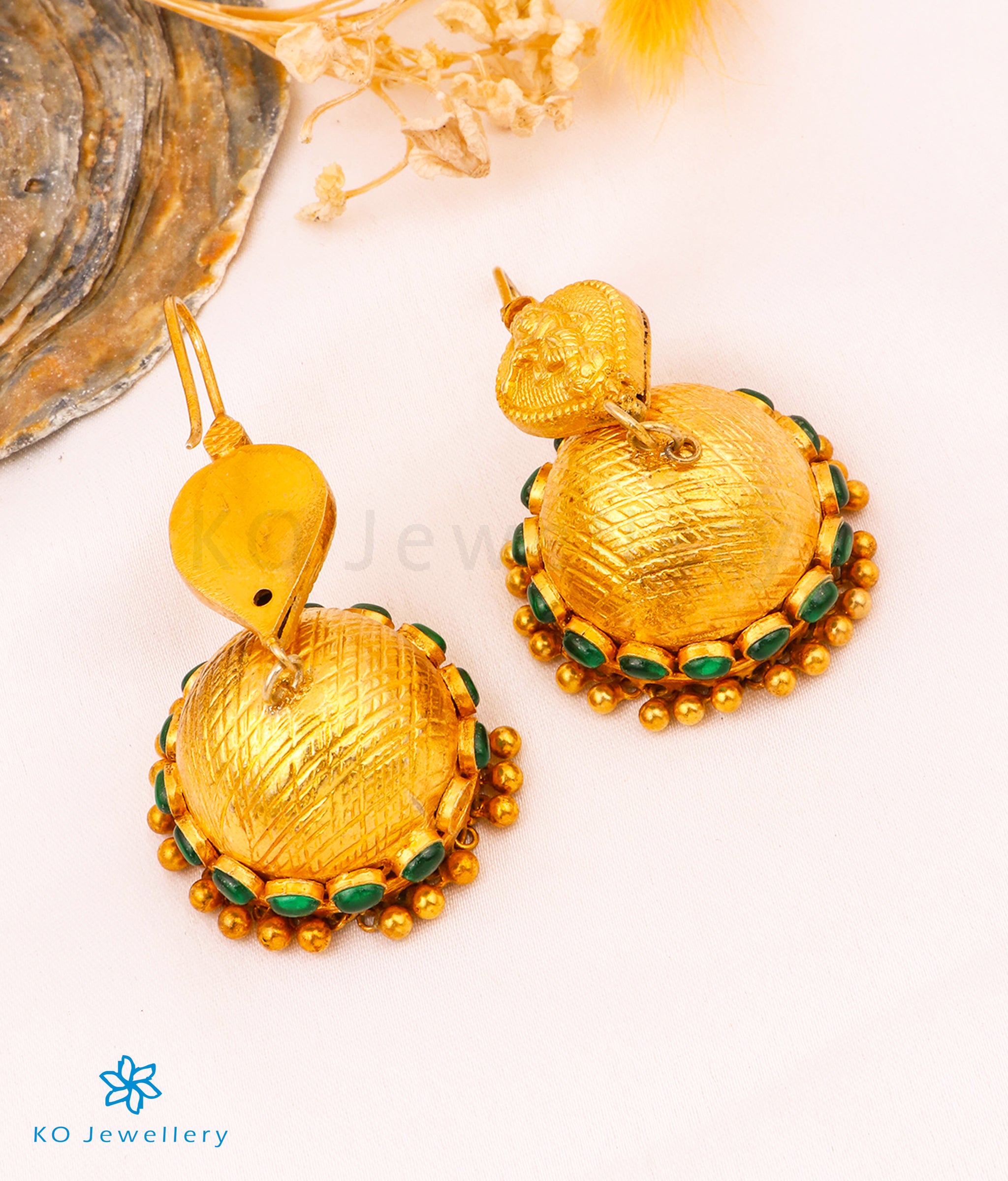 A beautiful kempu stone jhumka , the antique gold-dipped finish gives it an irresistable charm. Crafted using technqk jhuues used in ancient South Indian antique gold temple jewellery the entire piece is crafted in Sterling Silver (92.5%) silver .