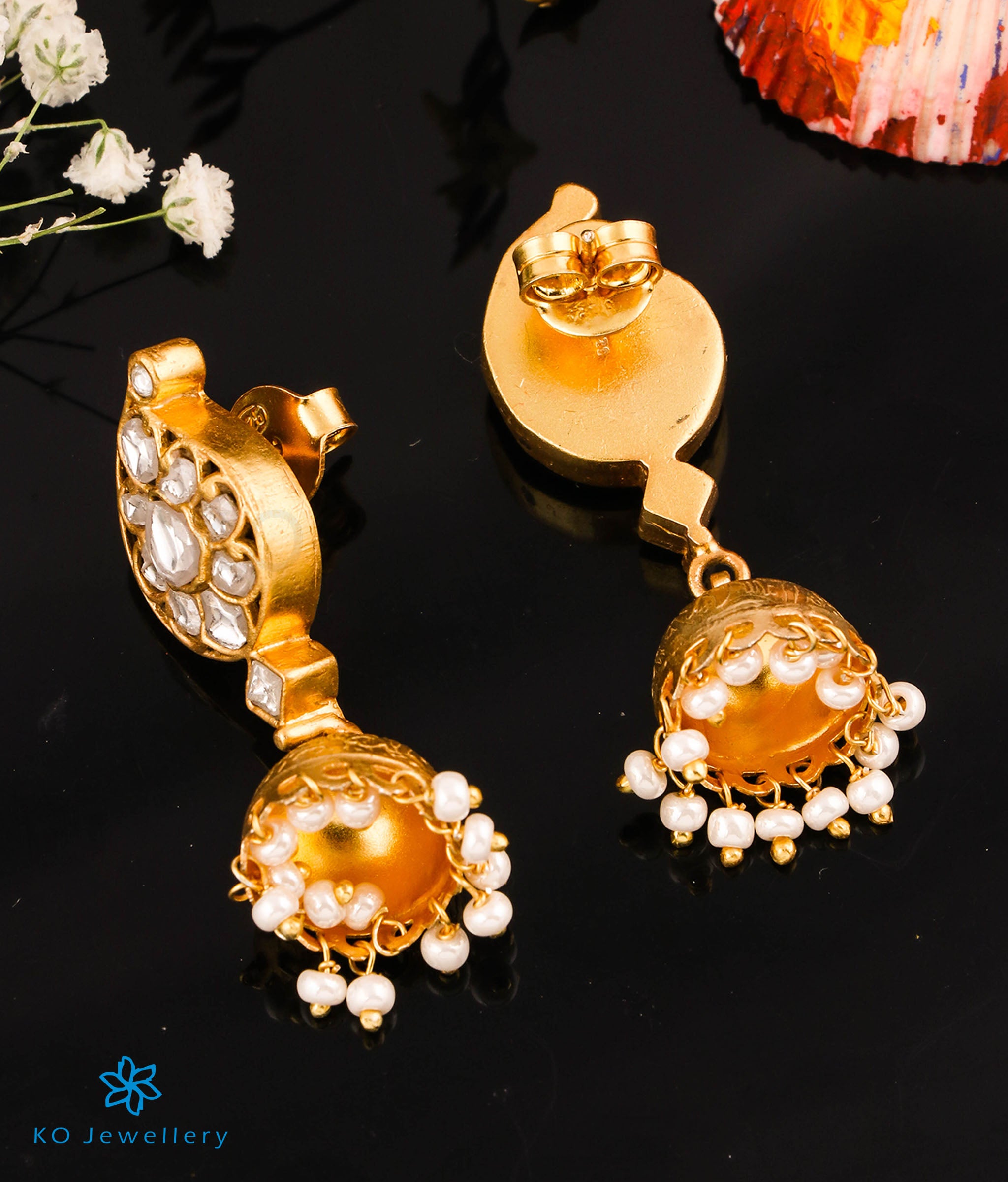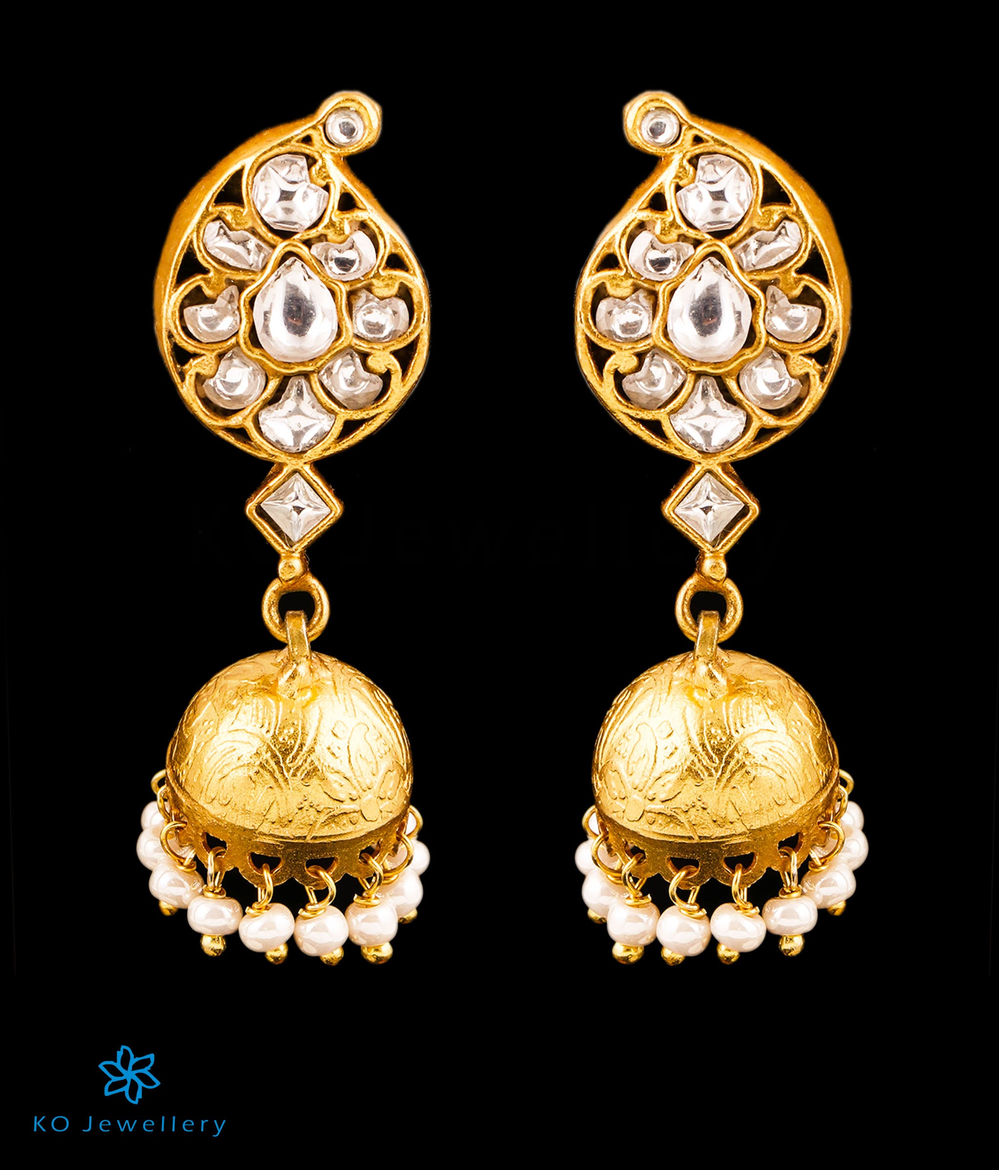 Bespoke and attractive these gold-dipped sterling silver (92.5%) jhumkas with polki stones will brighten up any outfit. The contemporary design and colour makes them a perfect match for your ethnic outfits. The jhumkas come with a push back closure.