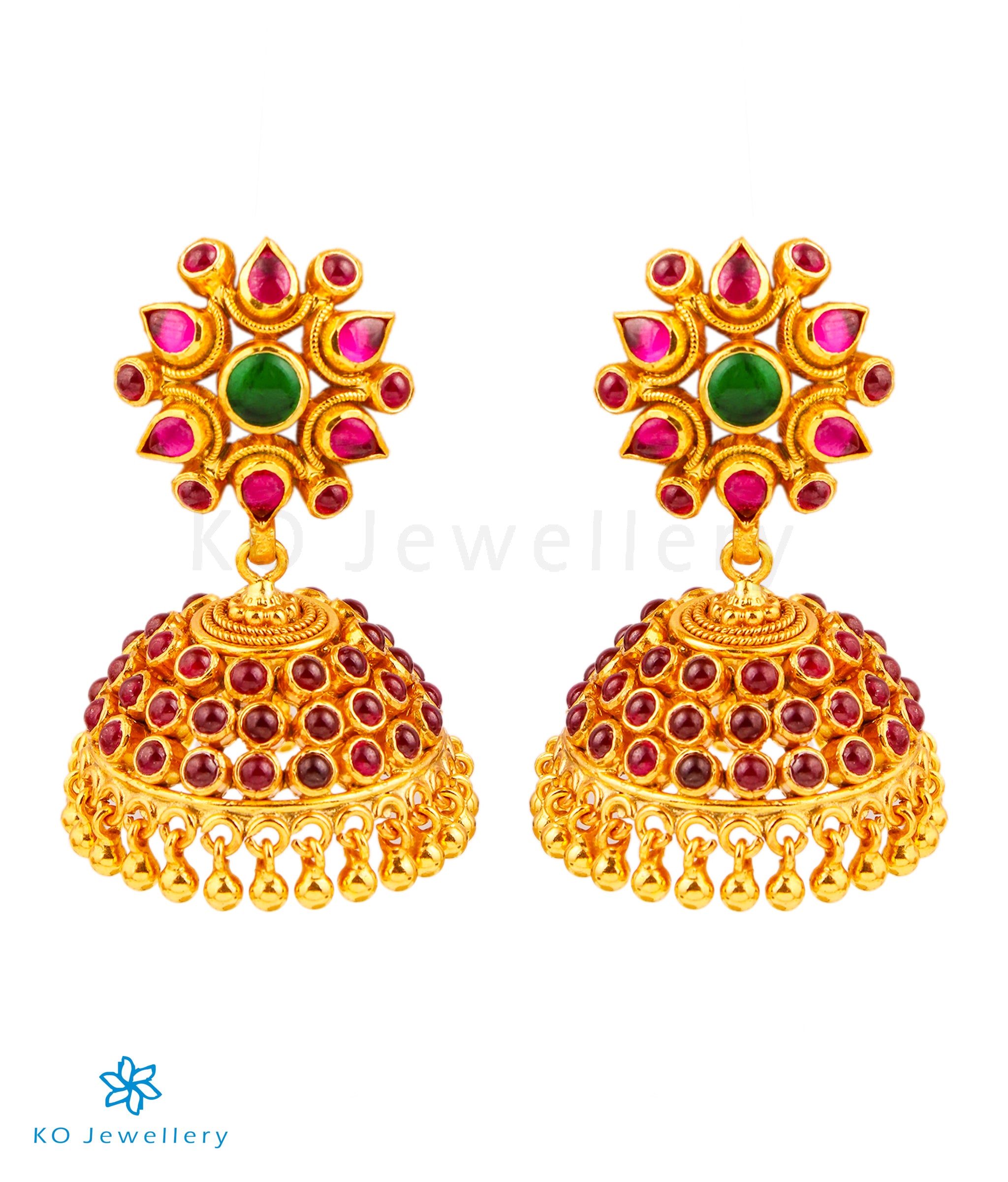 A gold-dipped sterling silver (92.5%) jhumka handcrafted to perfection , decorated with kempu stones.The floral ear-stud makes this jhumka more attractive while the beautiful jhumka which is crafted out of pure silver and decorated with kempu stones has a lyrical beauty of its own.
