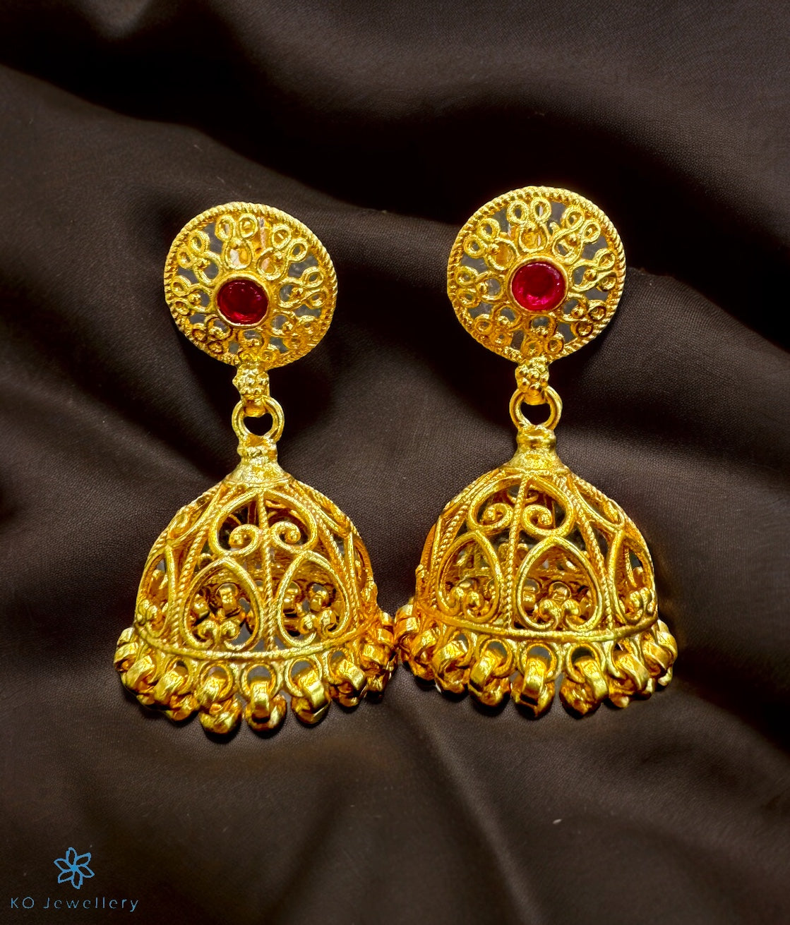 A beautiful jhumka with an intricate design, the gold-dipped finish gives it an irresistible antique charm. Crafted using techniques used in ancient South Indian antique gold temple jewellery the entire piece is crafted in Sterling Silver (92.5%) silver .