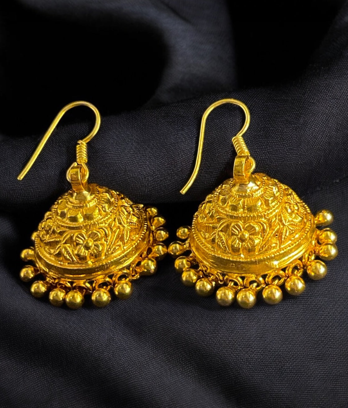 Beautifully intricate and gold-dipped, this Sterling Silver (92.5%) jhumka channels the elegance of South Indian temple jewellery. Lightweight and graceful — perfect for anyone who loves classic, antique-inspired style.