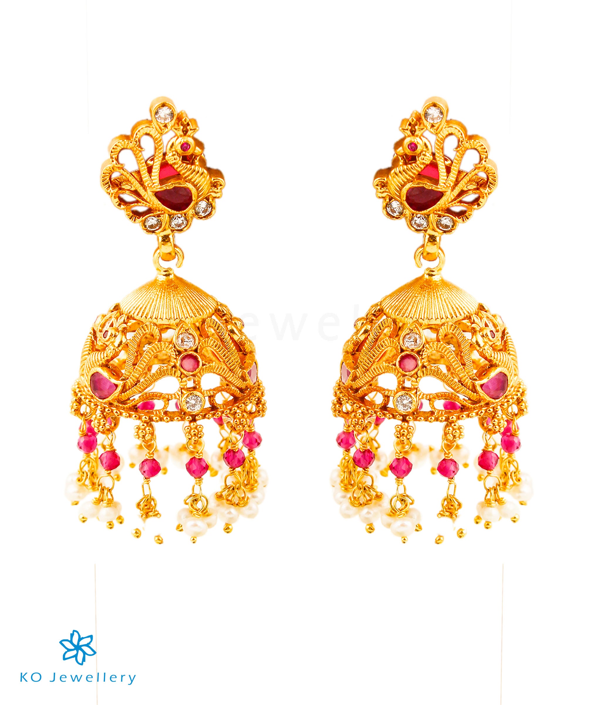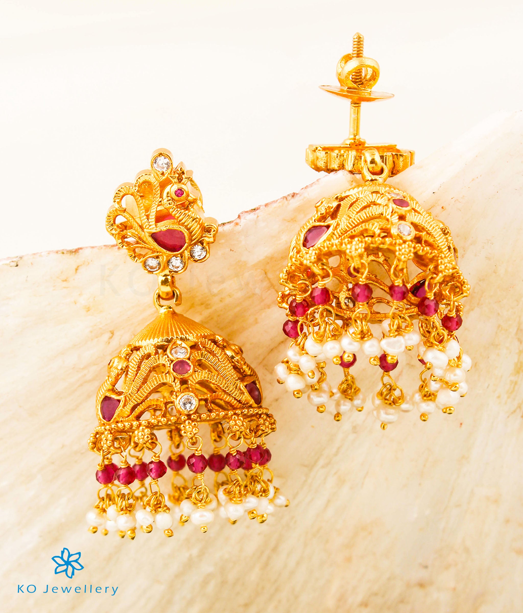 Extremely attractive and skillfully handcrafted this gold-dipped jhumka set with red `kempu' stones and AAA+ Quality Cubic Zirconia is simply stunning . Handcrafted with unmatched skill and perfection using techniques used in ancient South Indian antique temple jewellery, the entire piece is crafted in pure Sterling Silver (92.5%). This piece is available in the gold-finish on request.