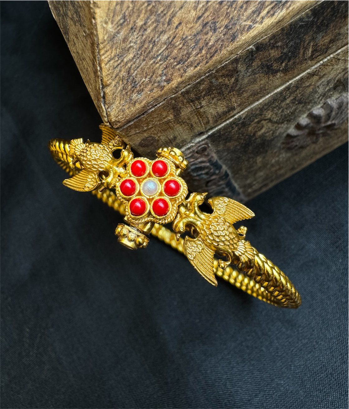 The bracelet is adorned with vivid kemp (red) stones, enhancing its regal character and vintage charm. Gold dipped in 24K gold to perfection, it carries an antique finish that echoes the grandeur of temple artistry. Designed with a convenient screw clasp, this openable bracelet ensures a flexible fit for most wrist sizes.
