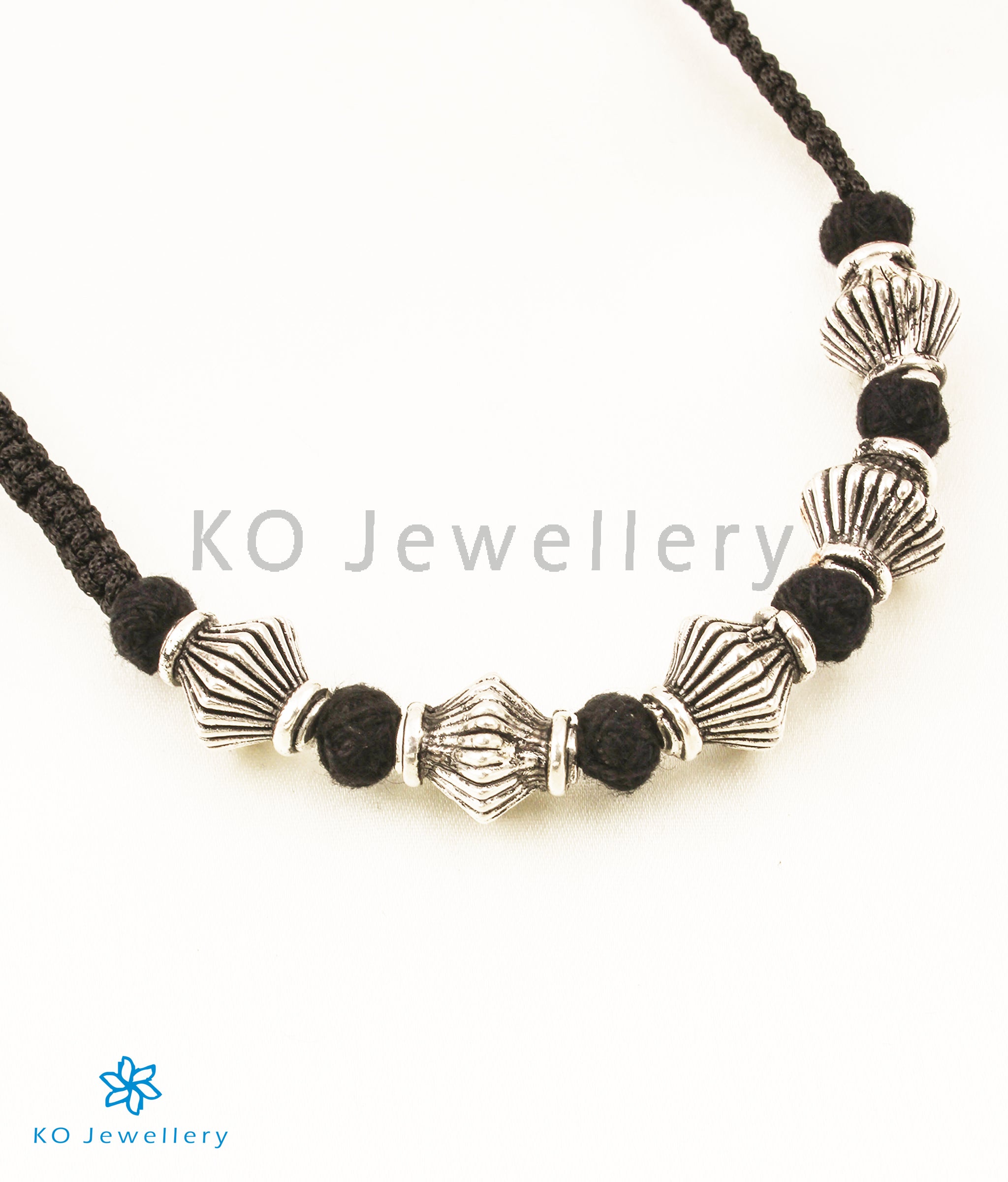 Add a pretty note to your festive wardrobe with this handcrafted plain necklace in which various sterling silver (92.5%) and black colour thread. Crafted using techniques used in ancient antique jewellery .