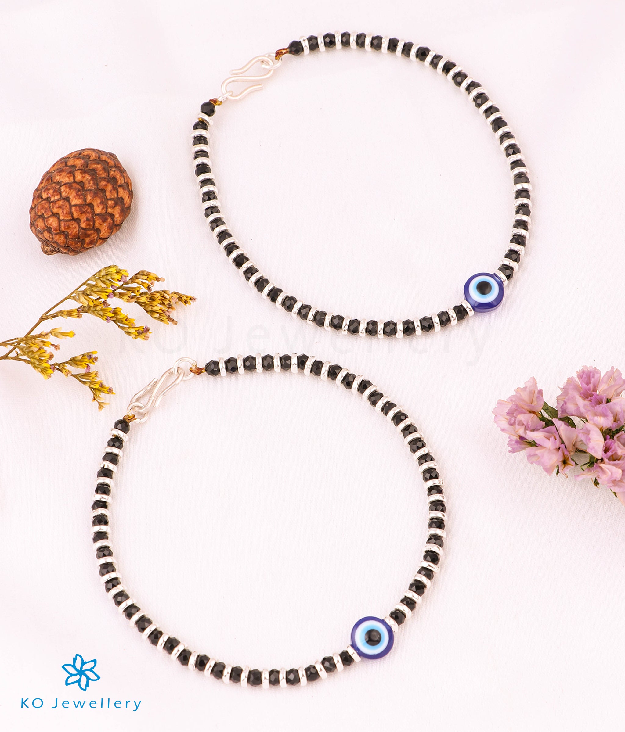 This is a versatile design in Sterling Silver (92.5%) that can be used as either anklets or bracelets according to your choice. This pair is adorned with a evil-eye pendant to ward off the bad luck . Made up of black onyx and silver beads it comes with a strong clasp. Handcrafted to perfection, these anklets pack the miraculous child-friendly properties of pure silver and make for a great gift.