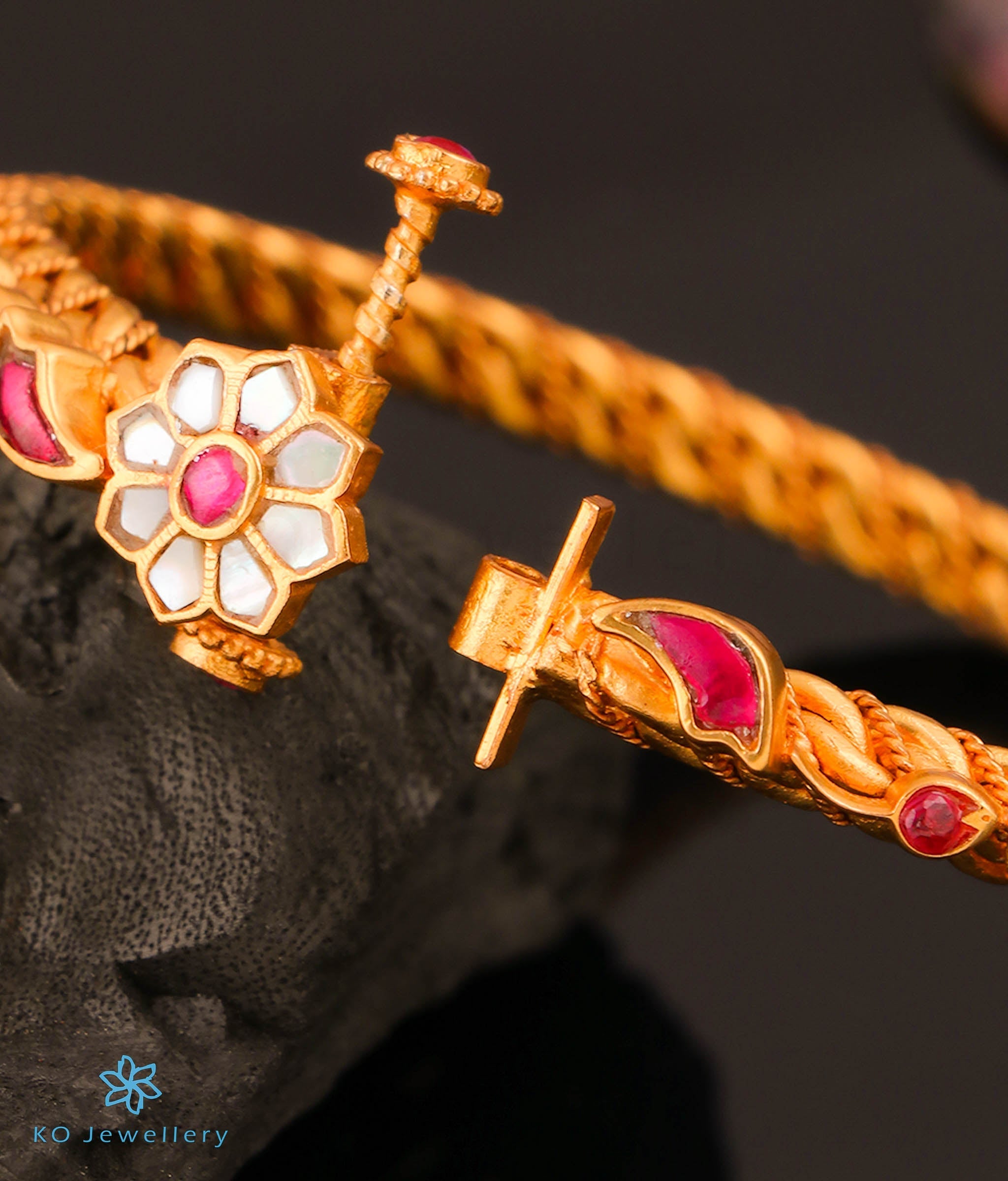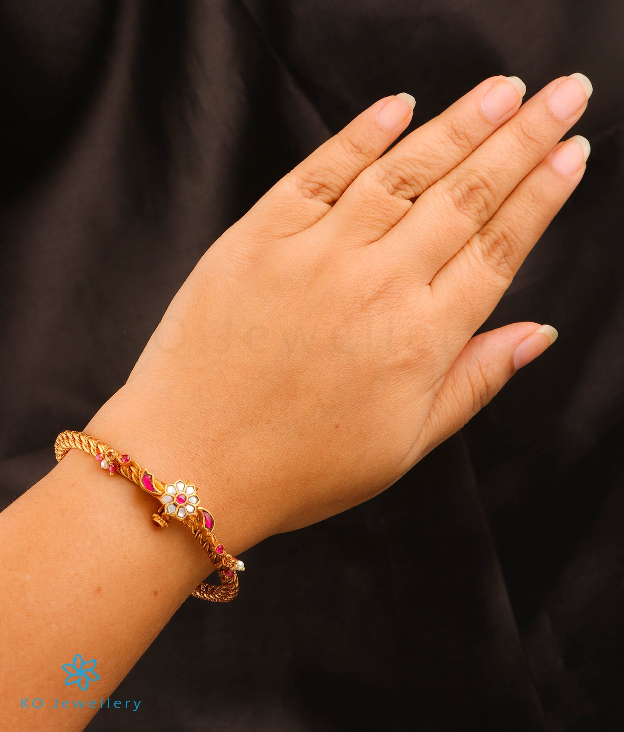 Outshine everyone with this gorgeous kundan bracelet . Beautiful polki stones come together in Sterling Silver (92.5%) dipped in gold to create this exclusive bangle that is fit for royalty. This seamlessly handcrafted bracelet comes with a screw and can be opened to gently fit your hand. The price listed is for a single bracelet.