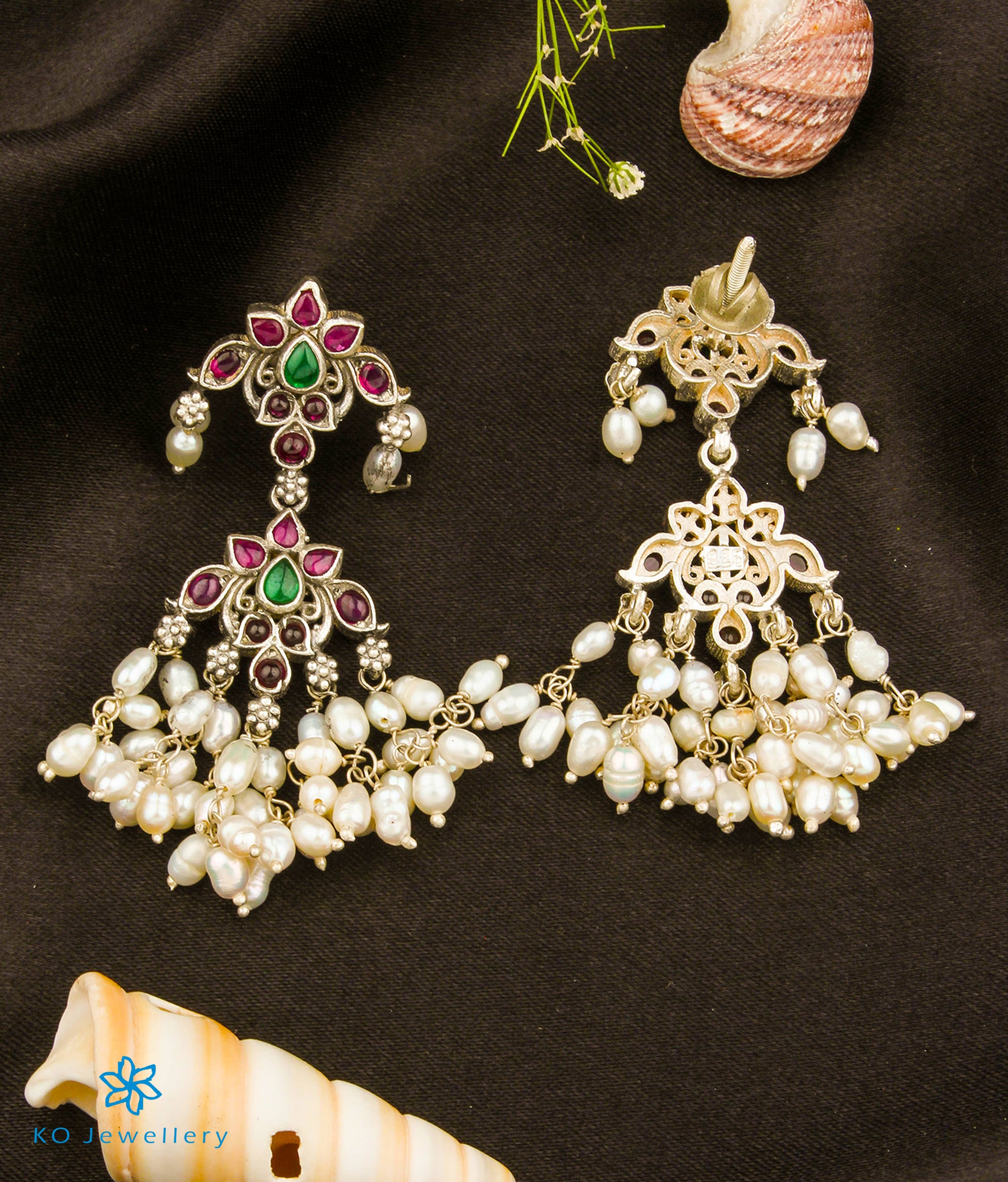 This is a earring for all occasions and moods. Crafted using techniques used in ancient South Indian antique jewellery this exquisite earring is studded with `kempu' (red , green) stones and pearl. The entire piece is crafted in pure Sterling Silver (92.5%).