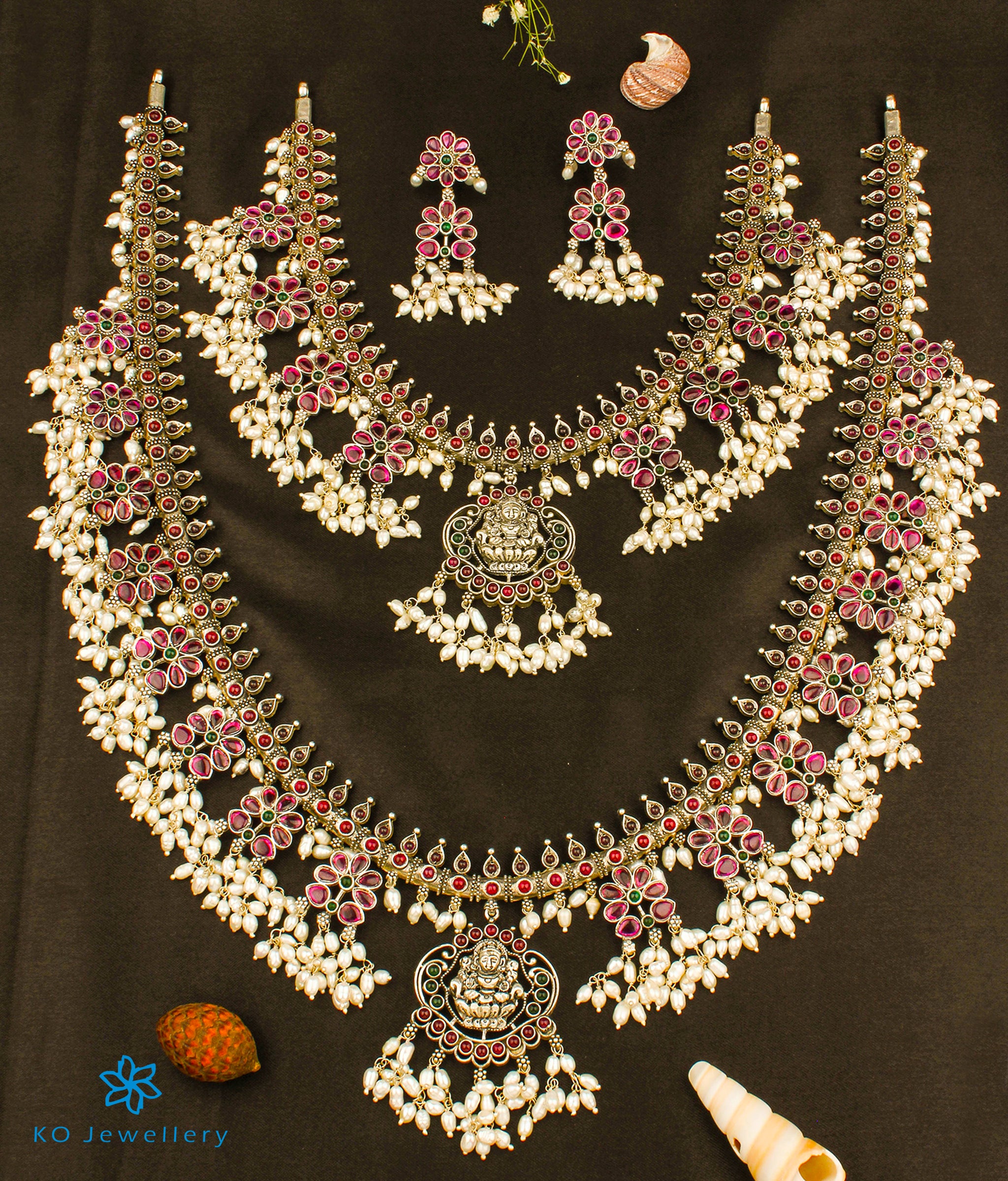Handcrafted in 92.5 Sterling Silver using age-old temple jewellery techniques, this piece is designed to be an heirloom. A gold-finish version is also available on request.