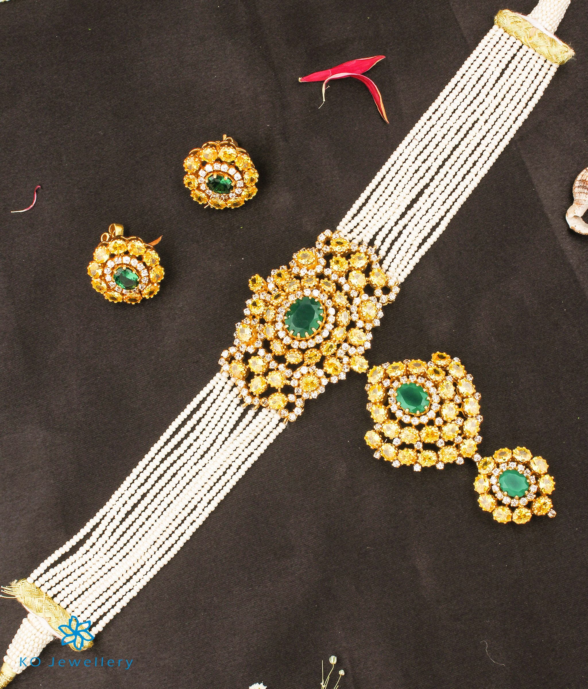 Feel like a modern day princess with this gold-dipped sterling silver (92.5%) necklace crafted in the ancient kundan-jadau tradition of jewellery. The elaborate design is studded with Yellow Topaz and faceted green Onyx gemstones and decorated with strings of pearl .The entire piece is crafted in pure silver and dipped in 24 karat gold. This necklace comes with matching earstuds which are part of the set.