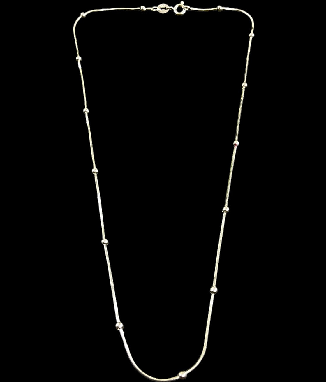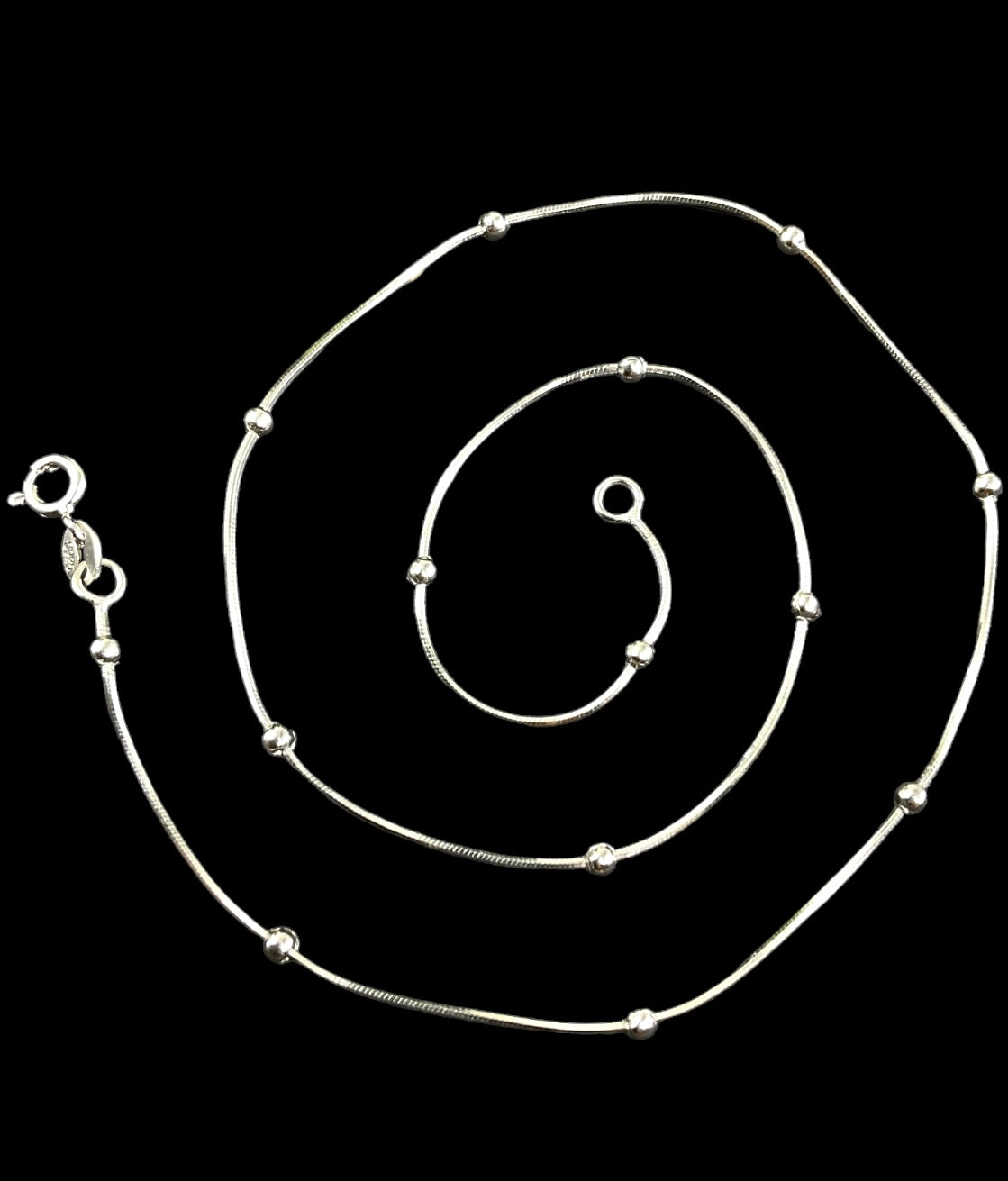 This is a shining , light silver chain crafted out of Sterling Silver (92.5%) . It comes with a safety clasp at the back. This is an ideal chain to wear light pendants on.