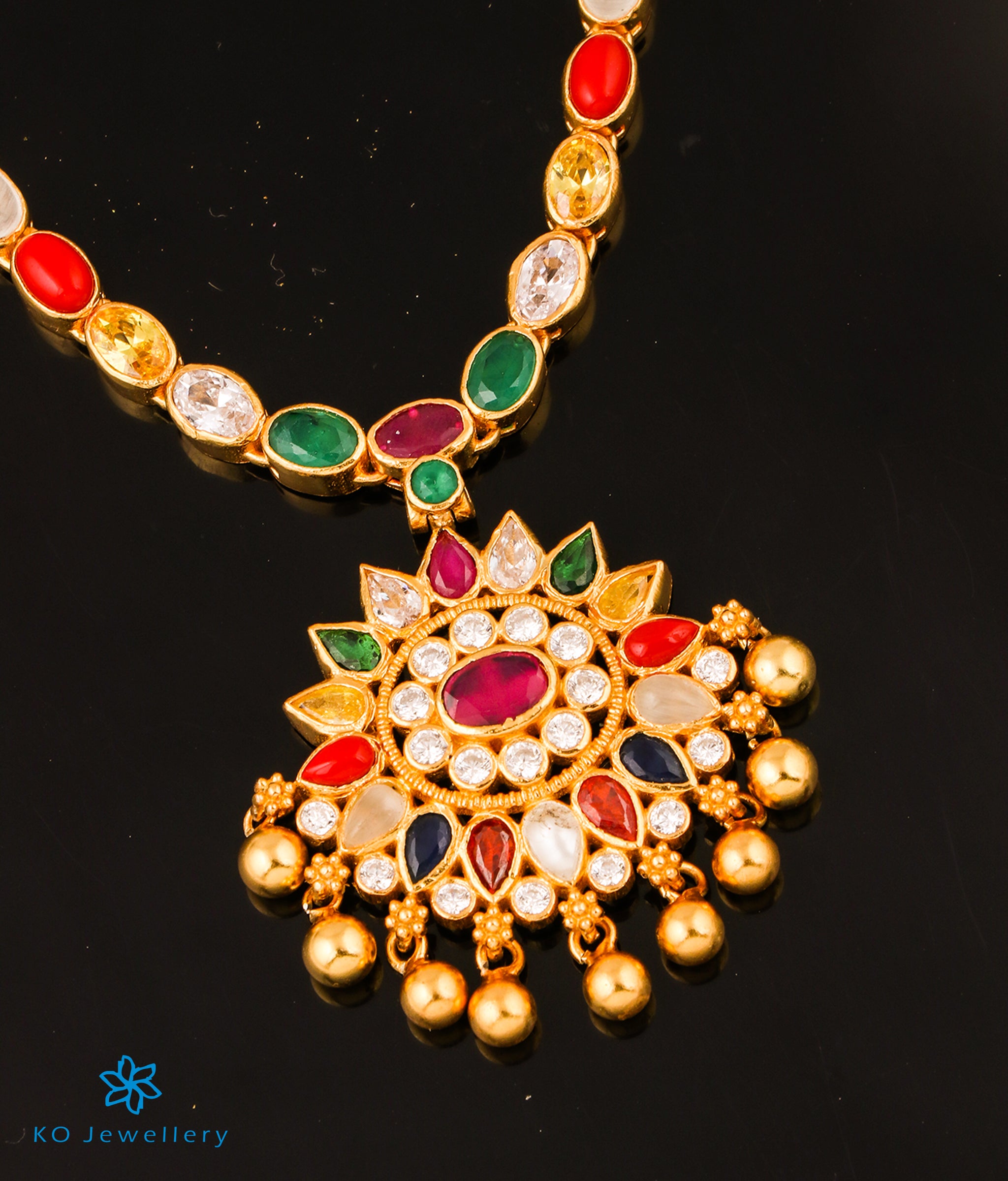 A gorgeous necklace set with Navratna gemstones , crafted in Sterling silver (92.5%) necklace. Fully handcrafted using techniques used in ancient South Indian antique gold temple jewellery this a striking piece of jewellery. It is paired with matching earrings.