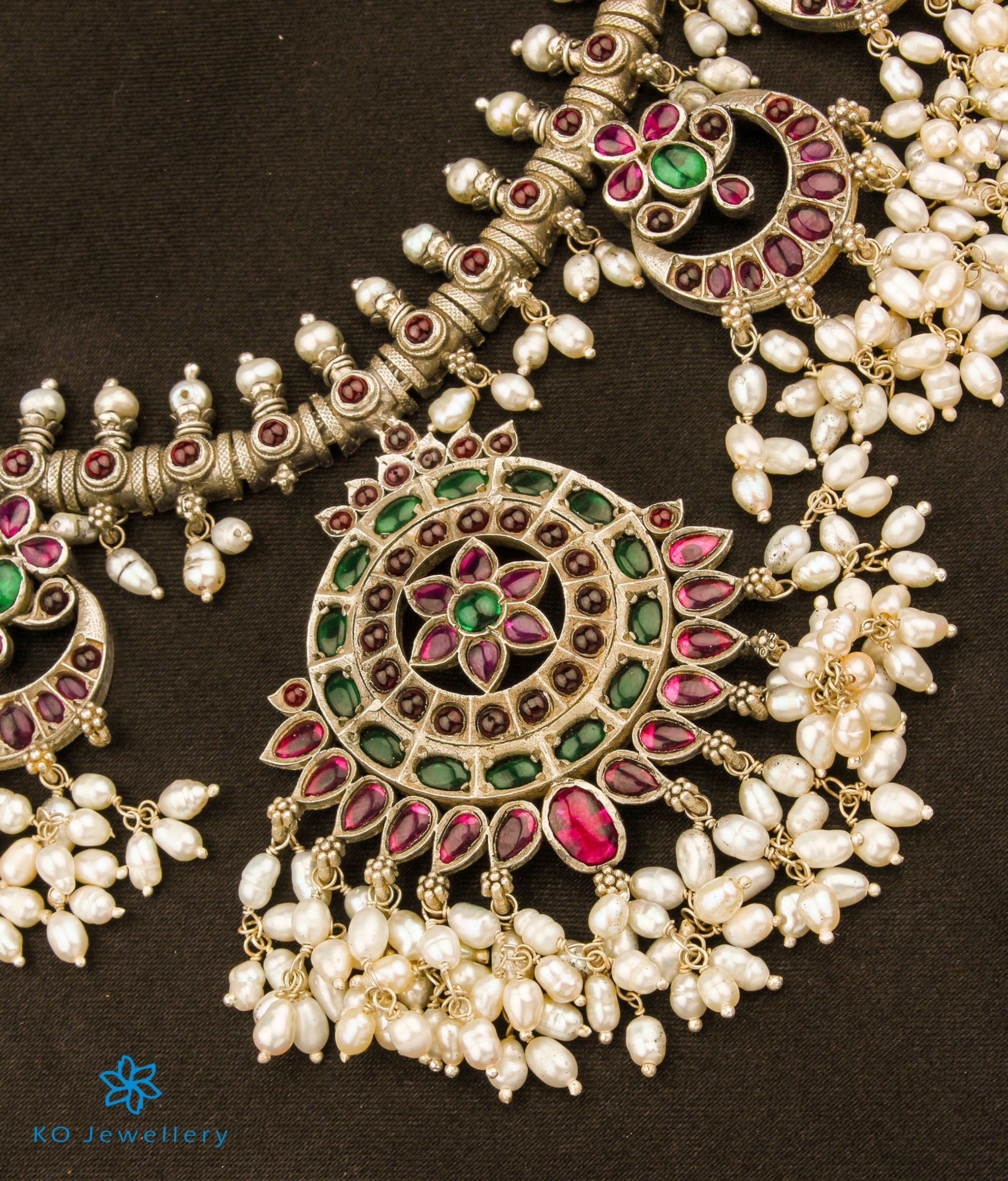 Handcrafted in Sterling Silver (92.5%) with techniques, used to craft temple jewellery for centuries this necklace is a heirloom piece. This necklace ia available in gold-finish on request.