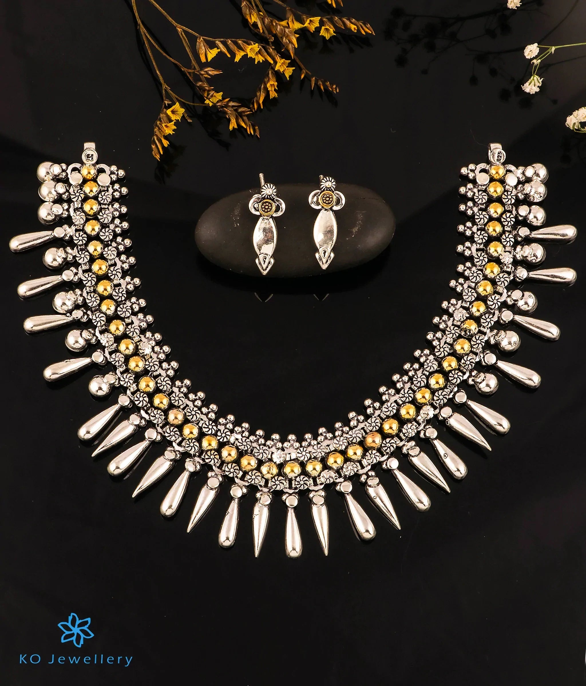 Wear a silver necklace in a two tone gold/silver finish, that is sure to direct all the attention to you . This intricate design necklace handcrafted in sterling silver (92.5%) makes for a beautiful accessory. This necklace comes with earrings to match and the cost given is for necklace & earrings both.