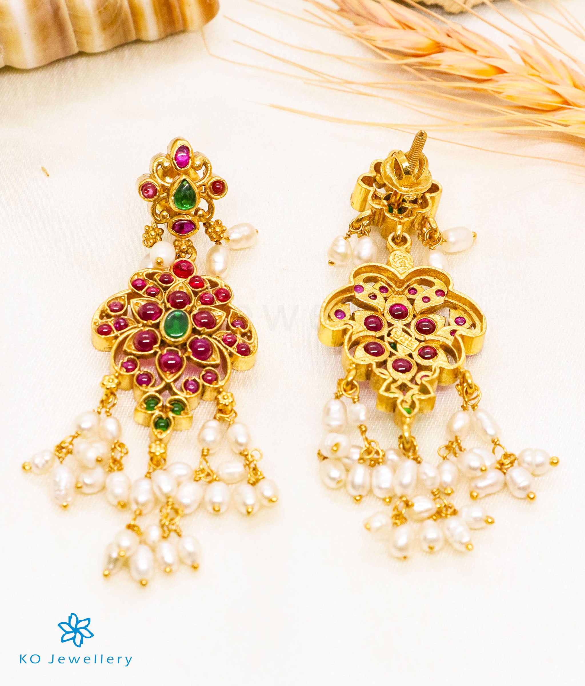 This is a earring for all occasions and moods. Crafted using techniques used in ancient South Indian antique jewellery this exquisite earring is studded with `kempu' (red , green) stones and pearl. The entire piece is crafted in pure Sterling Silver (92.5%).