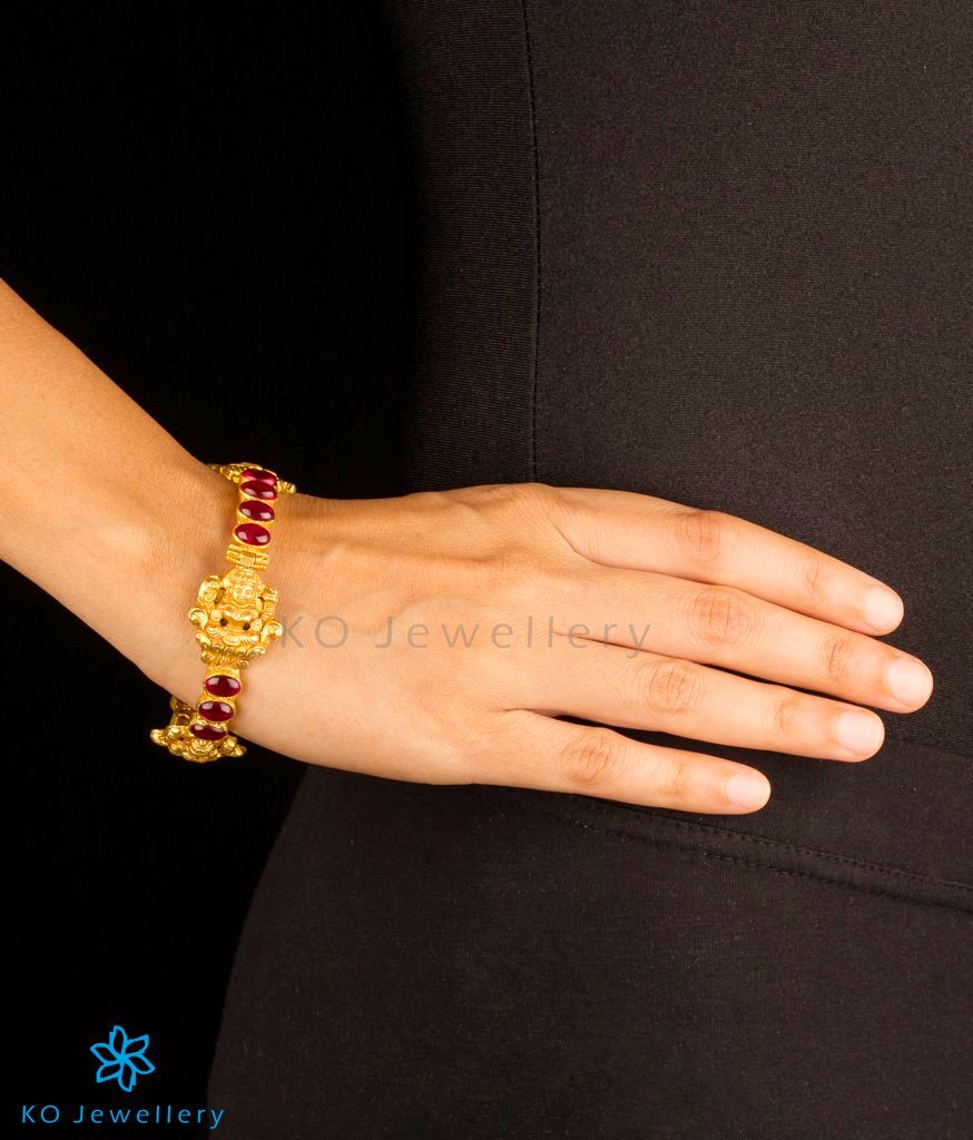The beautiful goddess Lakshmi adorns this bracelet which is decorated with oval kempu stones. Handcrafted in Sterling Silver (92.5%) ; this unique design will make a great addition to your collection. This seamlessly handcrafted bracelet can be opened to gently fit your hand. You could choose to buy it single or in a pair. The price listed is for a single bangle.
