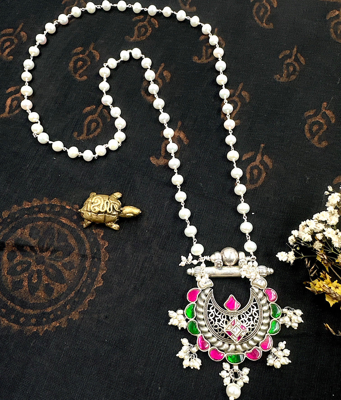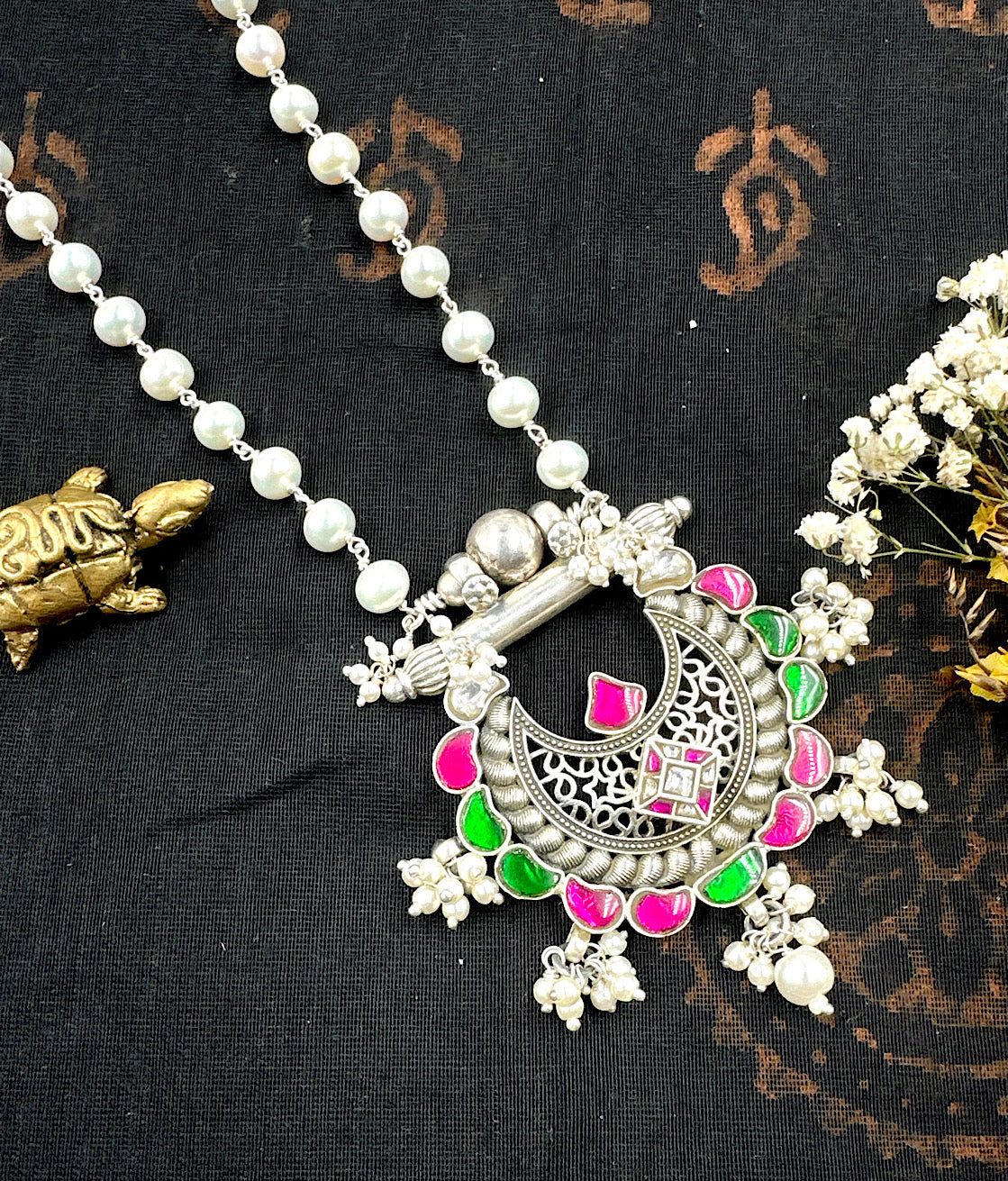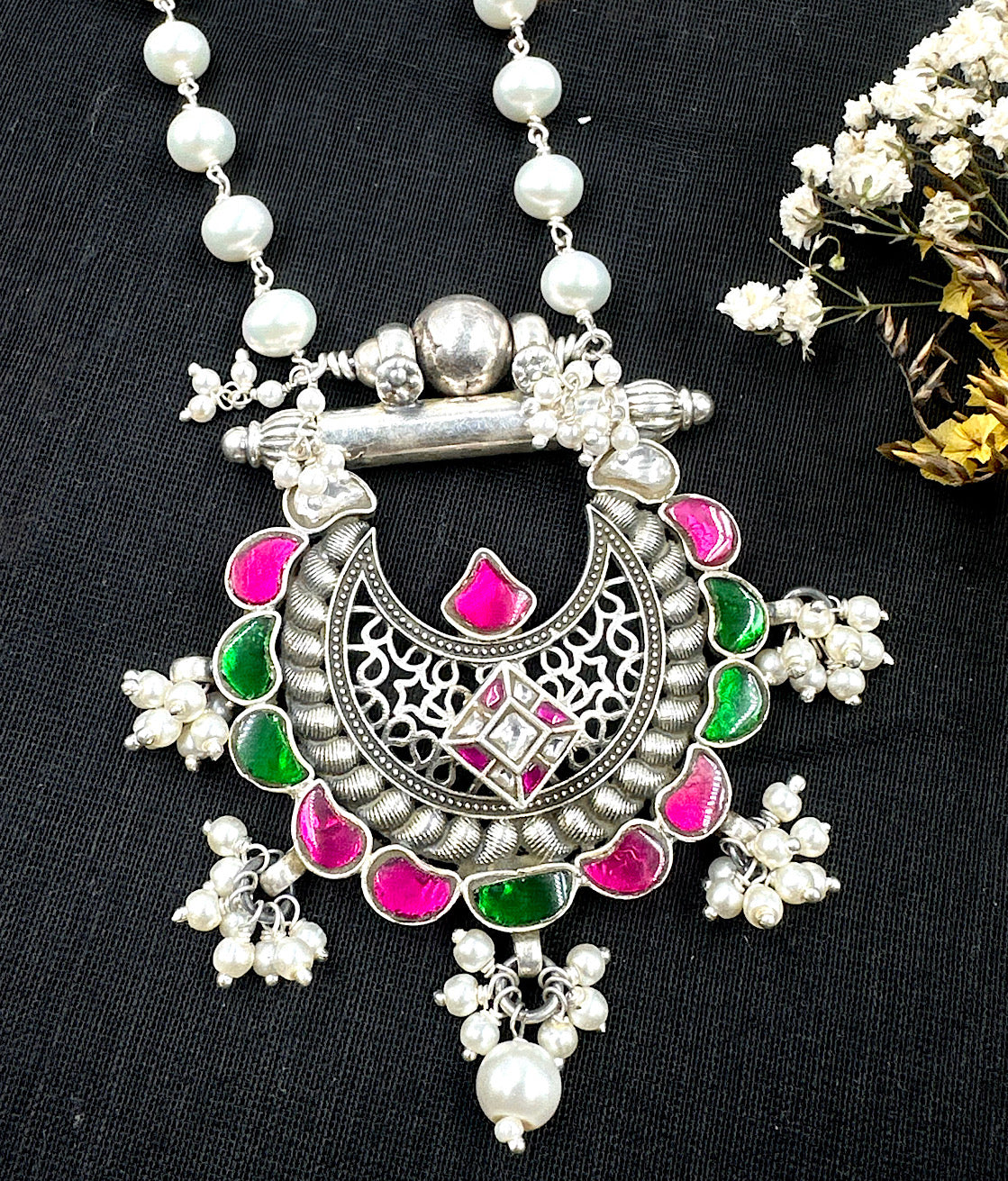 A necklace with a beautiful flower-motif pendant that holds you enthralled with its beauty. This is a gorgeous Sterling Silver(92.5%) necklace crafted in the ancient `jadau' tradition of jewellery. The pendant has an elaborate design and is studded with polki stones while the necklace string is made up of medium size pearl chain handwoven in silver wire.