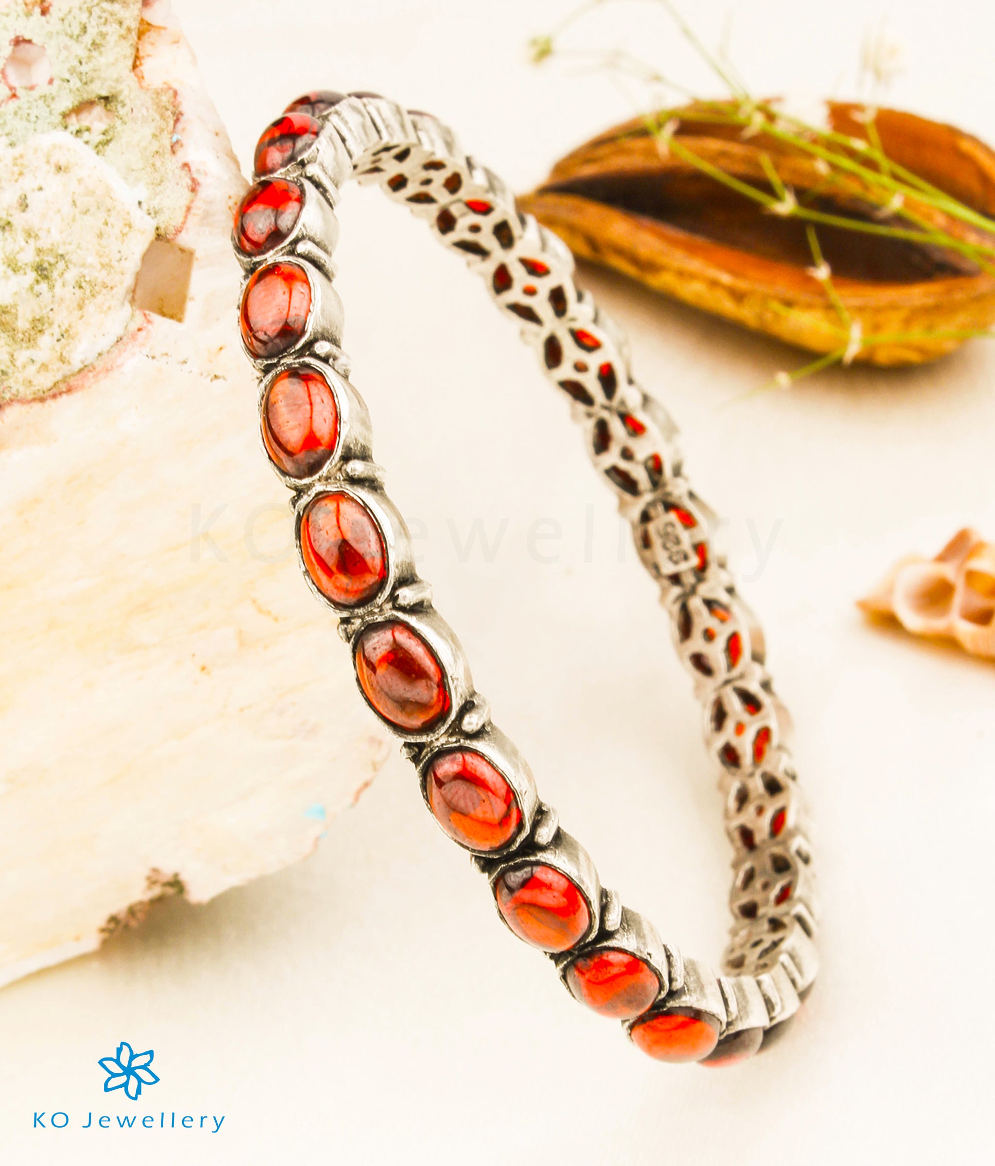 An attractive Sterling Silver (92.5%) bangle handcrafted to perfection to look graceful on every hand . The ornate design on the bangle is accentuated by kempu stones .Buy a pair of these bangles to complement your ethnic wear this festive season. The price listed is for a single bangle.