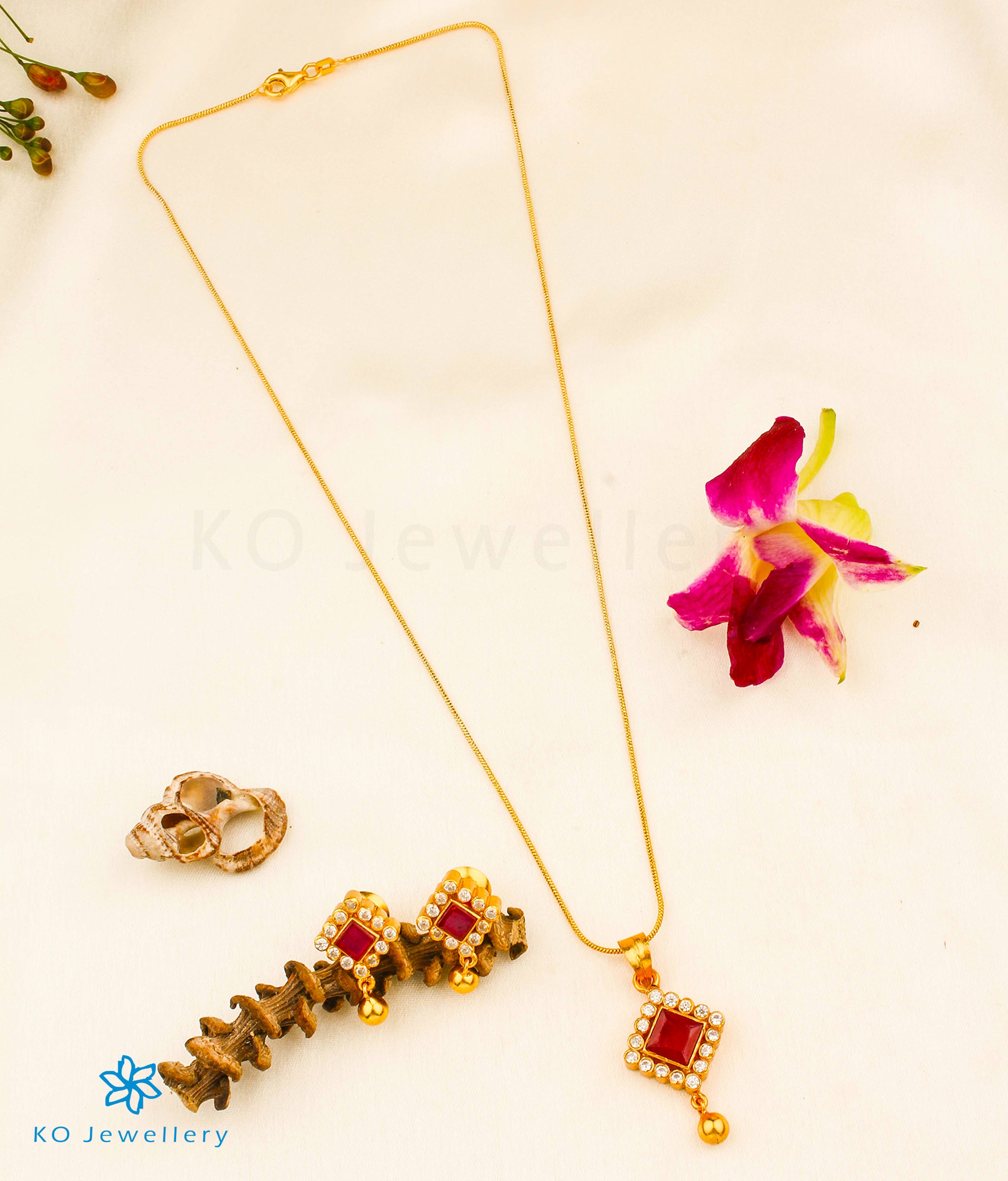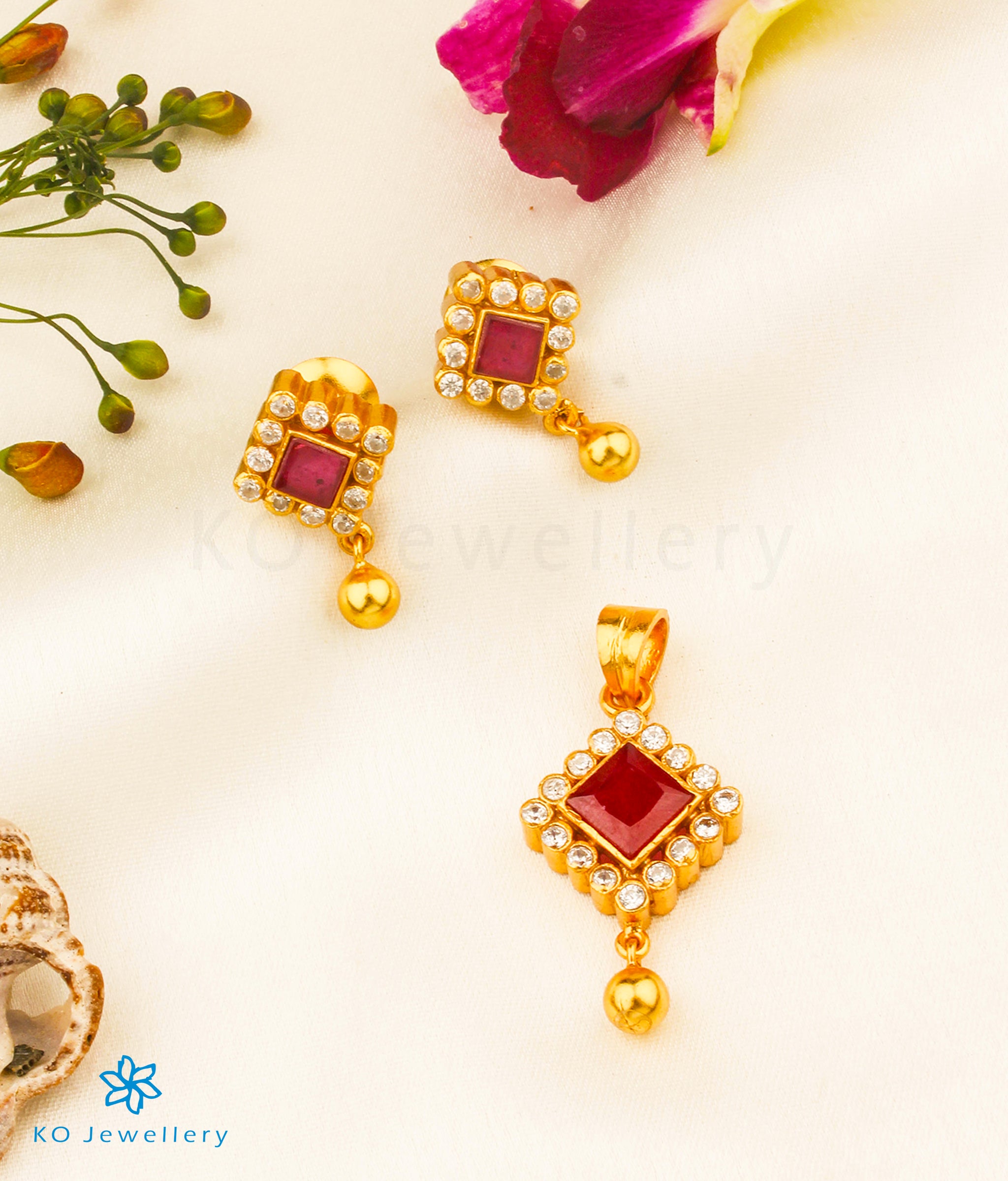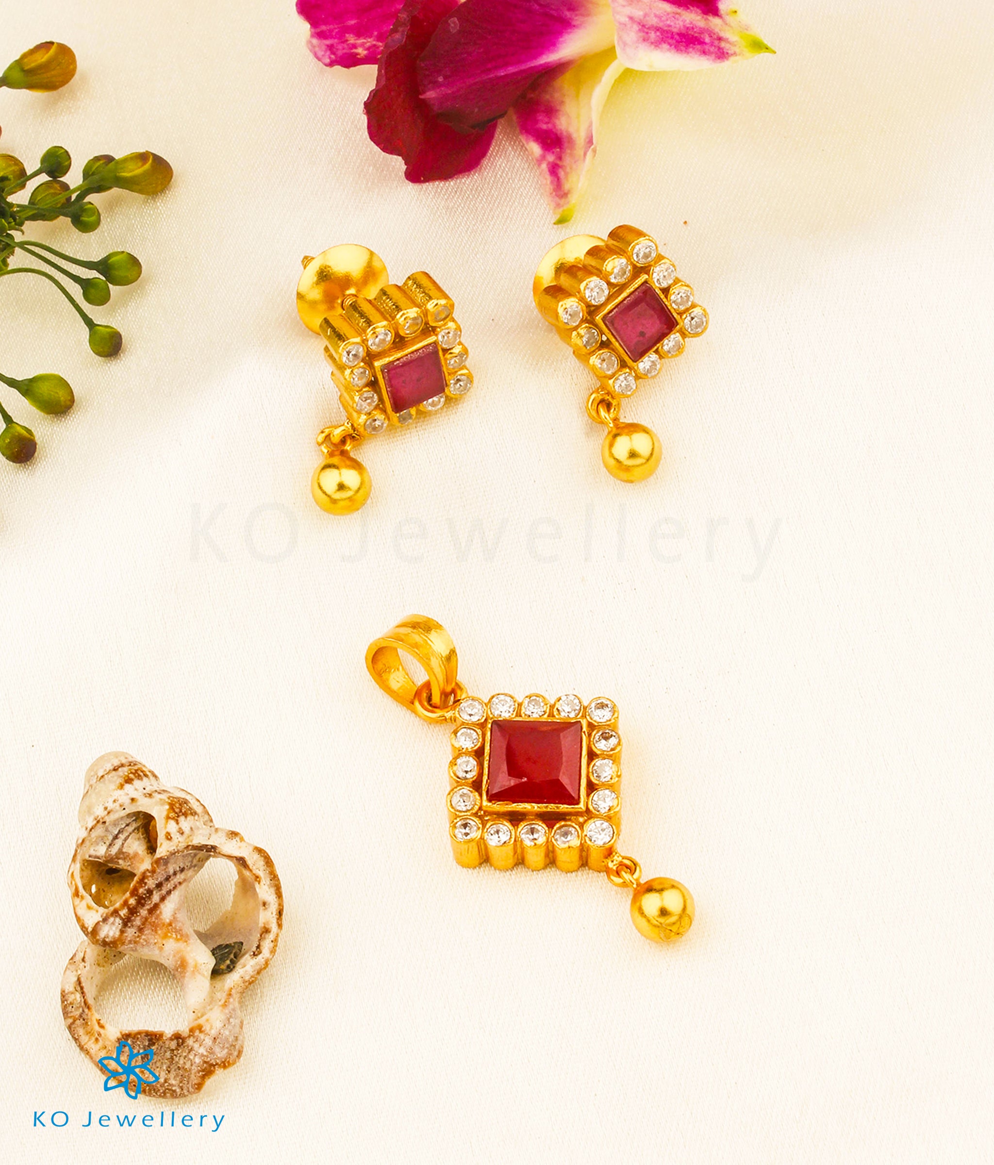 A pretty pendant set in a contemporary shape studded with kempu stones. Handcrafted using techniques from ancient South Indian antique jewellery this piece displays flawless craftsmanship. All pieces in this set are crafted in Sterling (92.5%) Silver and gold-dipped in a special process to give them an antique look. The earrings come with screw-back or bombay screw closure.